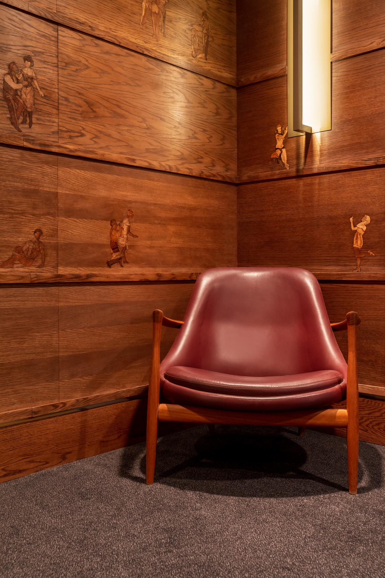 Throughout the property, contemporary art and furniture – some delightfully eccentric (I’m talking about you, brush-able hair chair) – mingle with carefully restored period features. Wood panelling, brass accents, and stained-glass windows remain in their original 1910 setting, seamlessly celebrated in the modern day. The Council Chamber, once a site of municipal deliberation, as it originally was, now hosts weddings, panels and film screenings. Elsewhere in the building, the Bethnal Hall and Secretary’s Room, in all their wood-panelled glory, retain original wall mechanisms that allow the spaces to expand or divide as needed. This is an incredibly dynamic hotel.