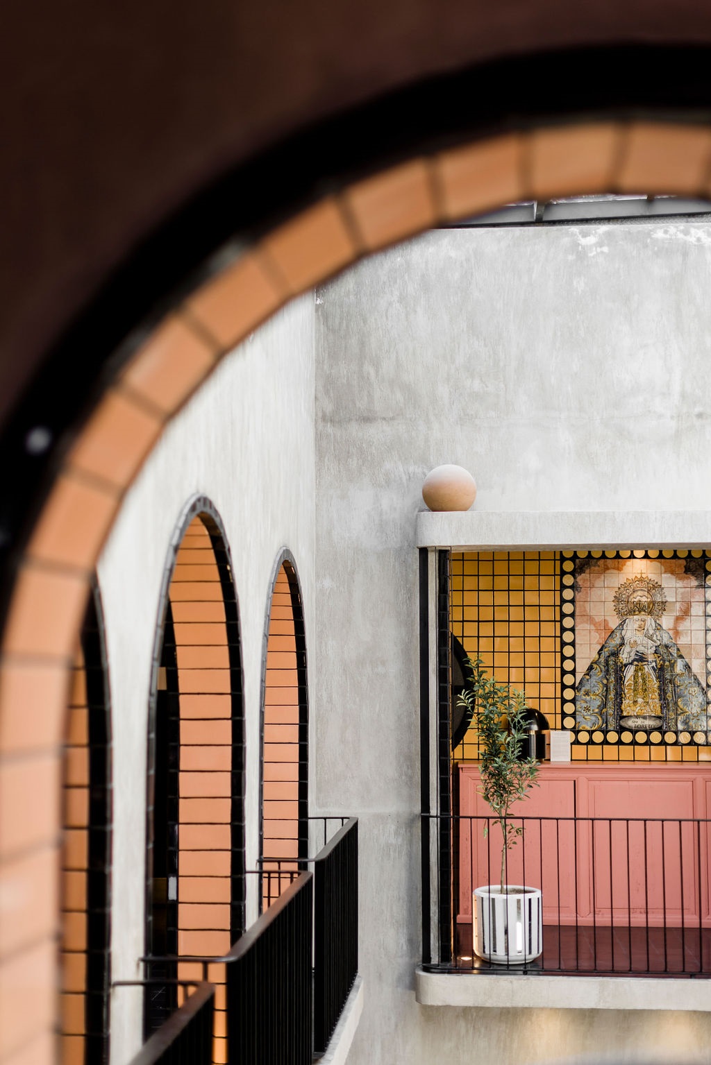 The interior layout is concentric and the spaces of the hotel, located on the ground floor and first level, are distributed around an open central patio bordered by Andalusian-style balconies, reminiscent of a typical house in southern Spain. At the back part of the first level, the mural of a Sorrowful Virgin of Loreto – made and hand-painted in glazed Talavera from the city of Dolores Hidalgo – crowns an altar that reflects one of the most deeply-rooted religious traditions of the Iberian Peninsula, from which the Hoyos family originated. Just below the virgin is the antique piece of furniture that served as the original counter of the bank. Like this restored piece, various objects that were found in the house for years were recovered to give them a new life within the project, remaining as vestiges and witnesses of the past.
