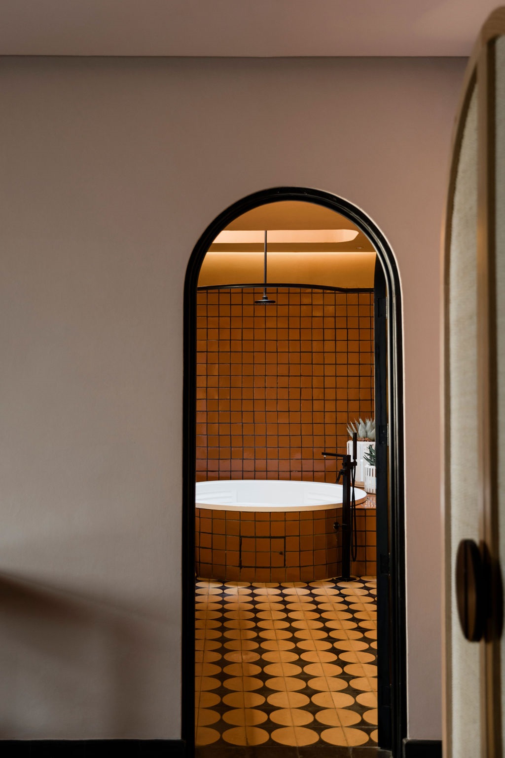 The starting point of the design was the style of an old Spanish manor where tradition and different metaphors speak to one another through colour and pattern. In each of its 16 guestrooms, Mexican design is introduced through unique artisanal pieces such as lamps, calaca armchairs, mirrored plant pots, and woven tapestries, which together highlight a custom-designed environment for the newest chapter in the history of this space. Yellow predominates in the palette and is a vibrant statement carried by the glazed clay tiles that, placed in a certain way, symbolise a corn cob. A range of ochre and red tones is present on different floors as well as in some wool textiles, which were handmade in the state of Guanajuato.