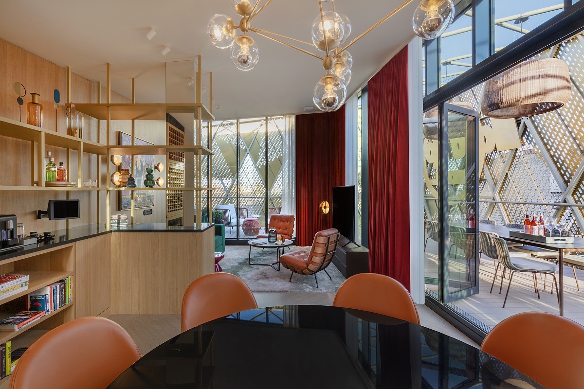 Entering the lobby, guests will discover a social, welcoming space, filled with musical touches and bright pops of colour. A yellow grand piano contrasts against cerulean blue velvet sofas, all framed by an assortment of curated memorabilia. There are over 50 items of musical and entertainment history proudly showcased throughout the hotel including Hungarian legendary singer songwriter, Janos Brody’s leather jacket, a vibrant purple faux fur coat worn by Prince and black sequin dress worn by Beyoncé.
