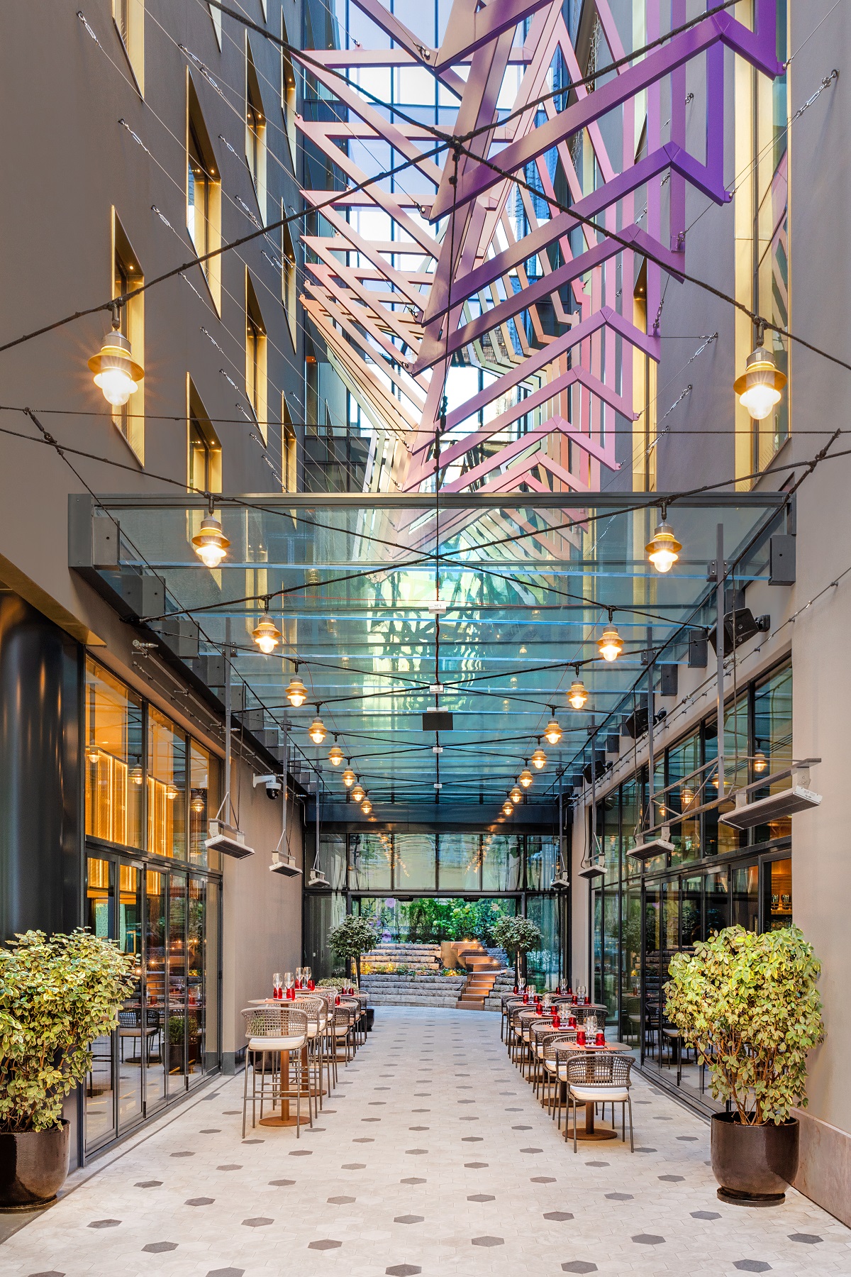 The hotel, with architecture by Hungarian Stúdió 100 Építészeti Kft. shelters 136 guestrooms and suites and two eateries and bars. The property blends an old Budapest facade enhanced with a sleek, new design. The historic part of the hotel is seamlessly connected to the newly-built section via interior glass hallways.