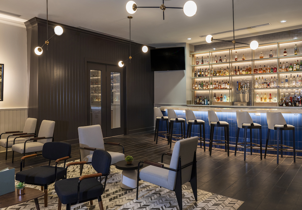 The guestroom palette and colour-blocking approach are influenced by Mark Rothko, an artist best known for his Abstract Expressionist works, examples of which are housed in the nearby Houston-based Menil Collection. In a nod to Rothko, a headboard light shines on a textured navy wall; the effect is a subtle variation in tone that creates a striking centerpiece for each guest room. Furnishings embrace a playful aesthetic and feel as if they are art pieces themselves. Casegoods feature elegant, curved corners, a departure from the typical brand standard of corner edges. In the bathroom, black floor tiles and grey porcelain wall tiles channel a vintage feel yet timeless feel.