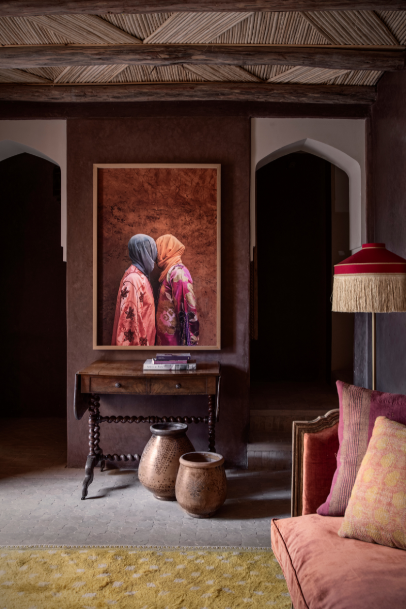 Importantly, Jnane Rumi positions itself as a cultural engine, not just a luxury hideaway. Under the direction of creative consultant Samy Snoussi, the house showcases a revolving collection of works by contemporary North African artists – Mous Lamrabat, M’barek Bouhchichi, Amina Rezki, among others – juxtaposed with European names such as Roberto Ruspoli and Louis Barthélemy, both of whom maintain strong creative ties to Marrakech.