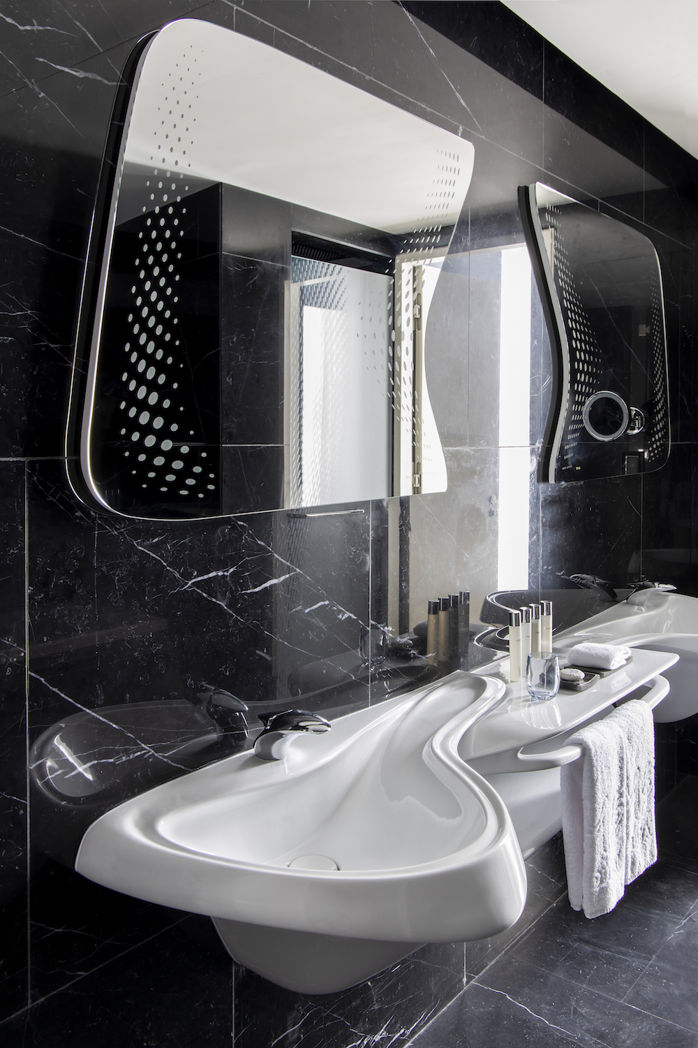 As I started to look more at the interior, I was surprised to realised that no wall was perpendicular to another and that many materials are cut on the angle or applied in complex shapes. The full marble bathroom, for example, white in the Aura and black in the Personality Suites, runs on the diagonal in both directions, so the pieces are actually rhombus shaped. These features very much reflect the entire design approach, to experiment and push the limits of what has conventionally been done up until now.