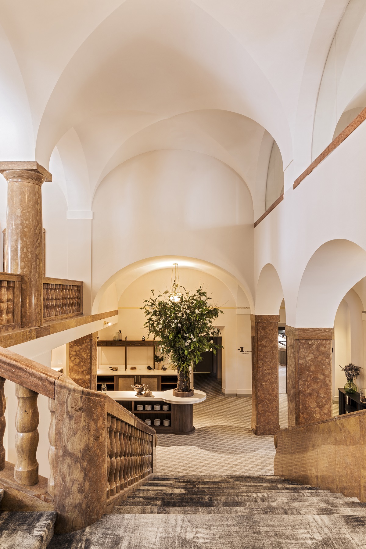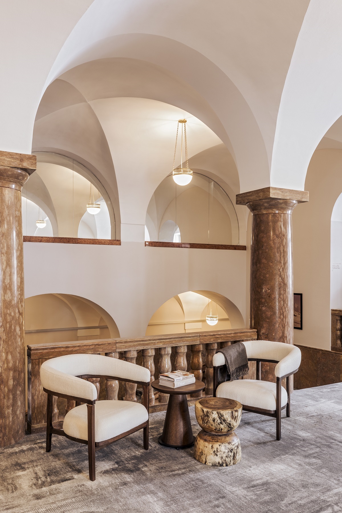 A Wes Anderson-inspired wooden reception desk nods to the hotel’s heritage and complements the stunning architectural arches within the cosy-chic lounge and hotel foyer. A sweeping marble staircase encourages guests down to explore the hotel’s Zus Brasserie and inviting cocktail bar, Alchemilla Parlour. The interiors palette is grounded in alpine neutrals, forest greens, burnt rusts, and golden sun ochres, warmed with characterful timber furniture and joinery. Tabletops feature light and dark terrazzo stones and berry-red marble swirls. The tailored joinery is softened by fluted banquettes and sofa-height dining set-ups, accessorised with rustic ceramics and scattered Slim Aarons artwork, a nod to the retro village of Arosa.
