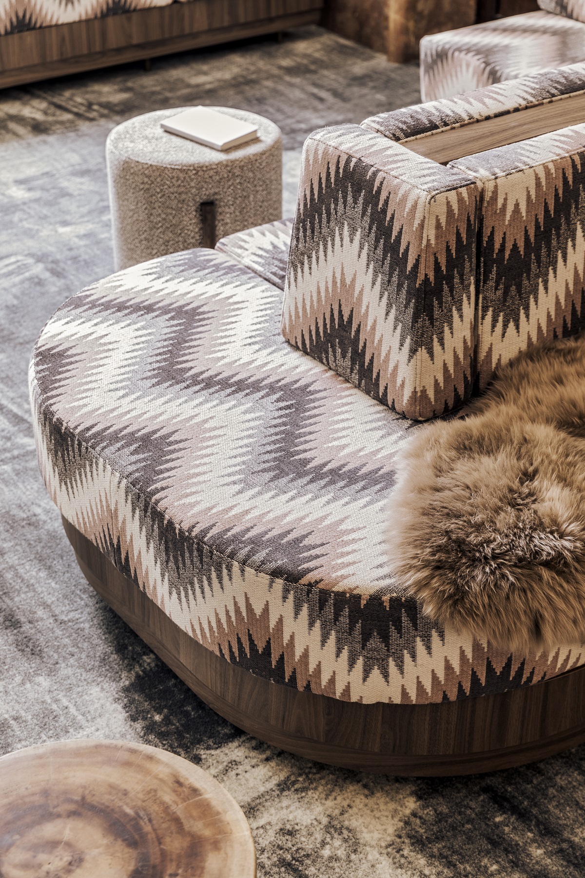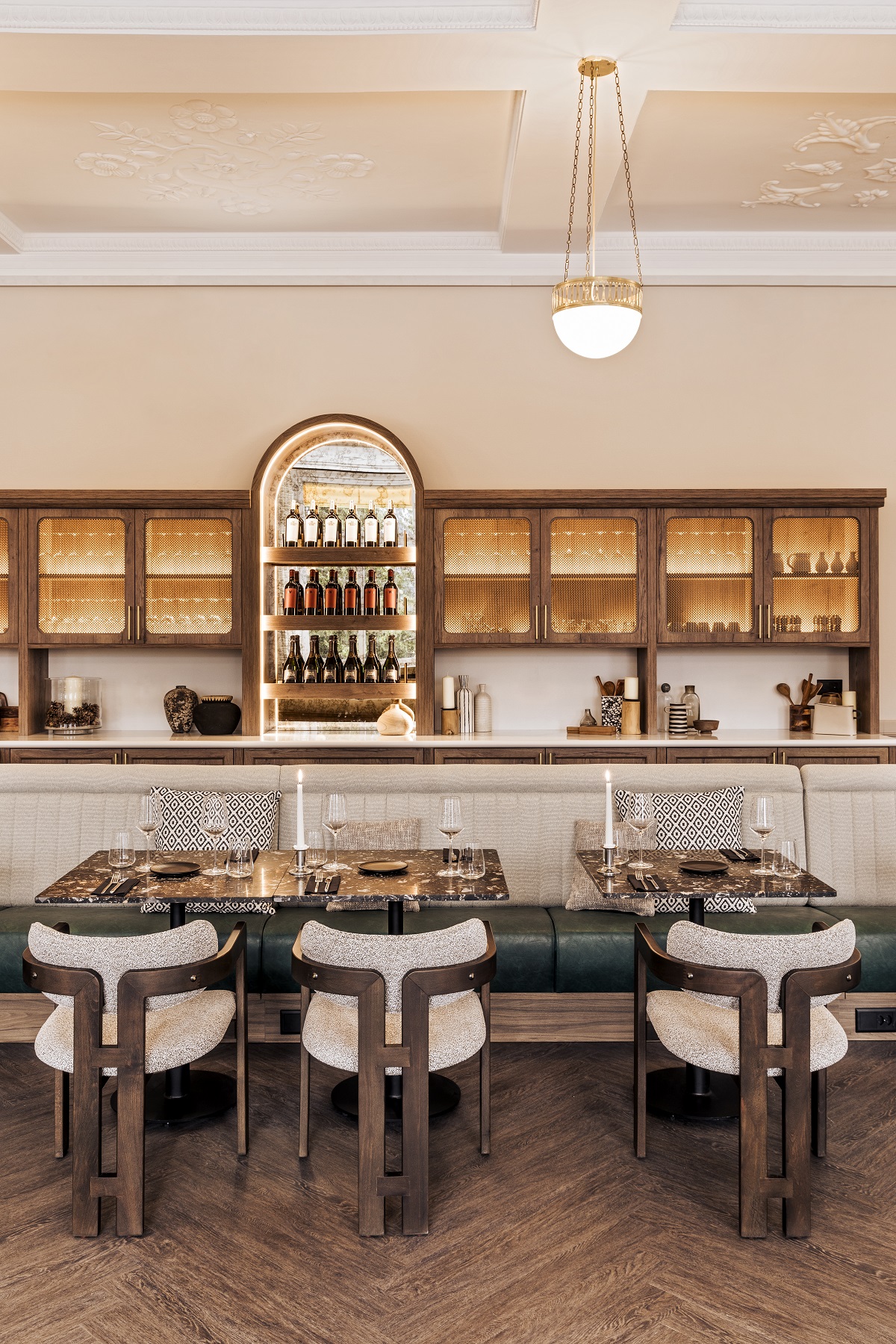 The hotel has several distinct spaces for both dining and drinking, including the stucco ceiling Grand Dining Room Zus Brasserie. Surrounded by large windows, this spacious room provides exquisite mountain and village views. The nature-inspired material palette features warm and organic tones, rich timbers, bouclé and wool upholstery fluted banquette sofas in forest greens, berry reds and bark browns. The structured dining chairs combine angled forms with Deco-inspired curves. These are given a contemporary twist with graphic art and mirrors suspended from ironwork rails that reflect the stunning views beyond. The Rustic Buffet adjoins Zus Brasserie, set under a statement decorative tree that celebrates the full height of the beautiful arched space, framed by the swirling marble staircase.
