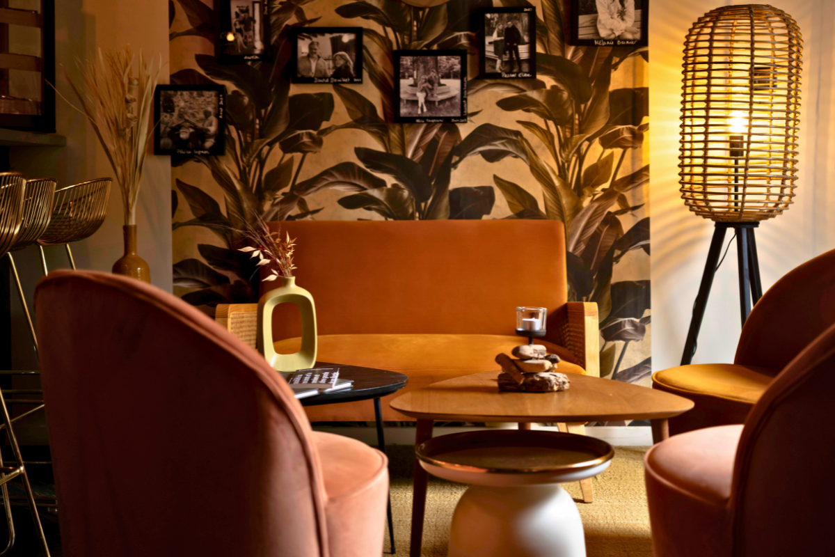 Beyond the shop, the space unfolds into an open-fire-warmed bar โ a cocooning, tactile environment that feels deliberately designed to slow time, ground guests and invigorate the senses. Sumptuous velvet seating invites guests to sink in, while natural timber furnishings and layers of impossibly soft textiles soften the space further. Whether settling in with a book, bottle of wine, or reaching for a pack of cards, the room is designed to suit quiet afternoons or softly glowing evenings illuminated by flickering firelight.