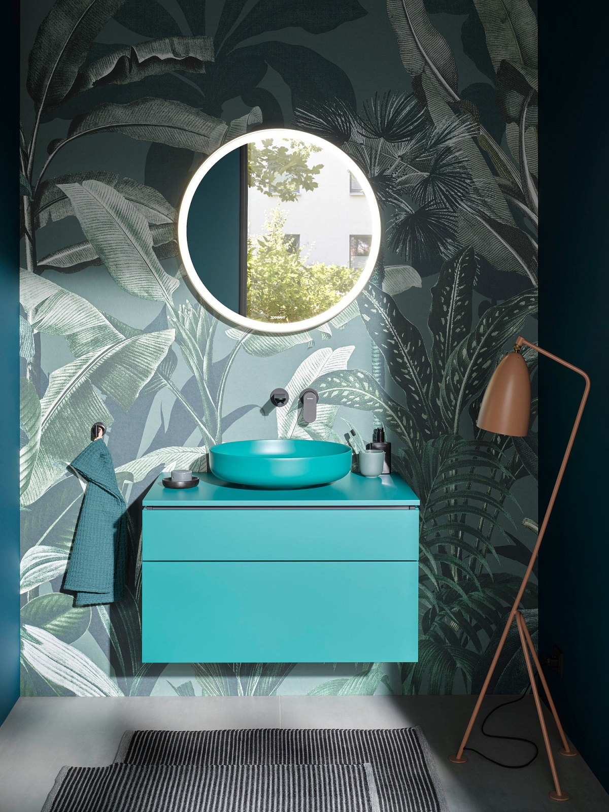 Patterned wallpapers can be used to create tasteful and unique bathrooms. Whether a guest toilet or main bathroom, the result can be a real eyecatcher. Another option is working with a tone-on-tone scheme, using washing-area combinations in matching colour shades to make a statement in the bathroom. The exclusive Vitrium Colour Christian Werner concept in Blue Green offers appealing tone-in-tone solutions.