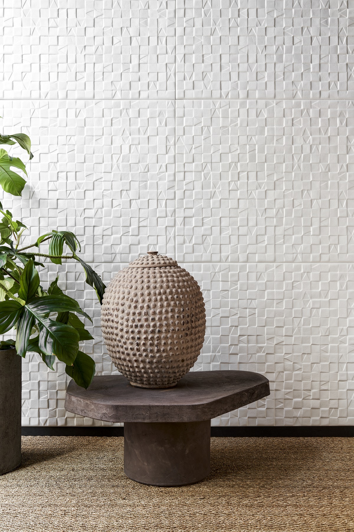 The tile-shaped design of Mejdoul has a great deal of relief, due to the technique used and the voluminous material. The pattern is inspired by date palms, a common plant in the Middle East. The Adobe wallcovering plays with various kinds of relief, both in height and depth. The irregular squares and triangles create a playful, geometric and intriguing effect. The design refers to unbaked clay tablets (adobe) that are dried in the sun.