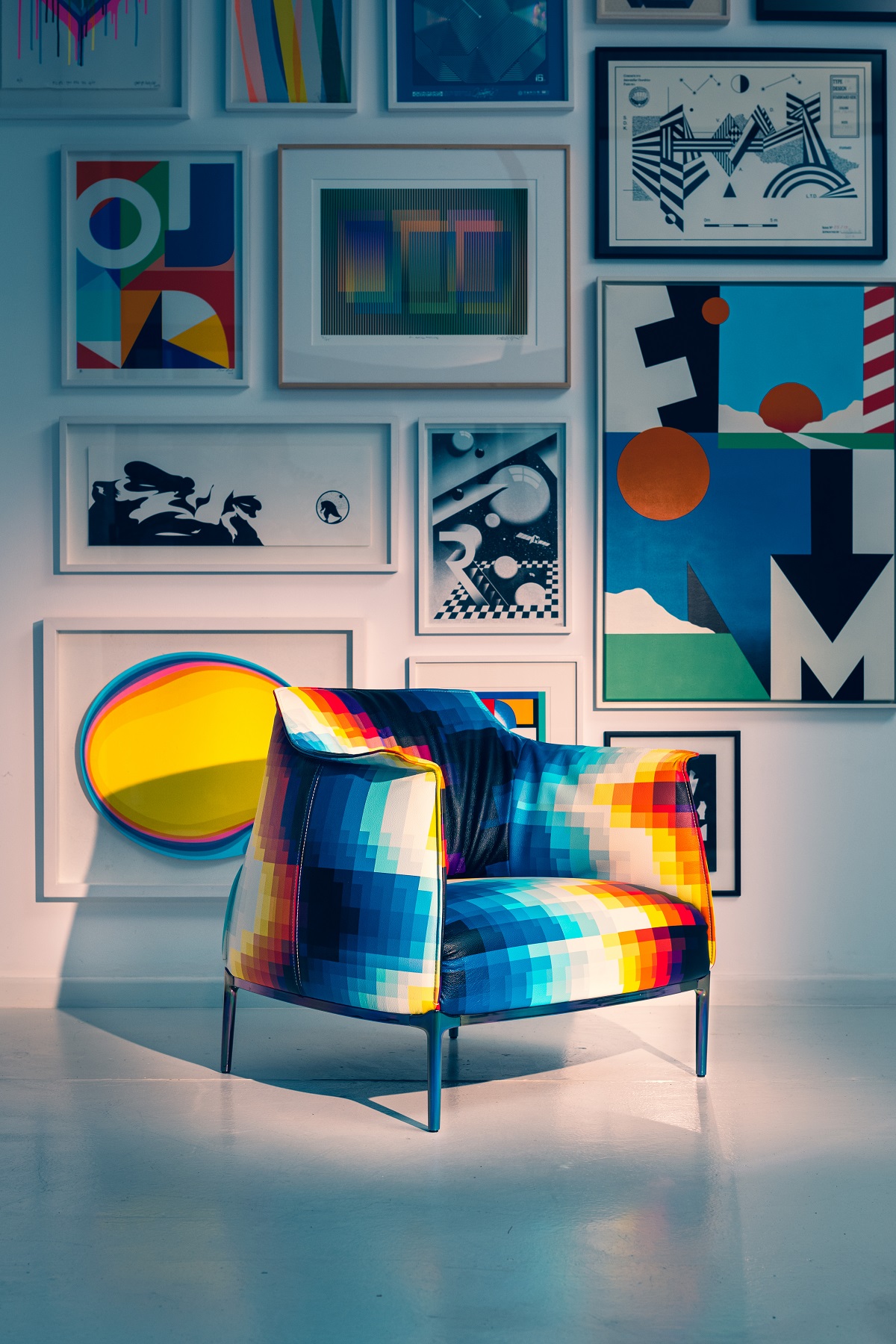 “I had the opportunity to visit the Poltrona Frau Headquarters to see the Museum, the entire collection, and learn about the Brand’s history which is extensive and very impressive,” said Pantone discussing the collaboration. “We ended up choosing Archibald as the base for my work because of its minimal frame, but also the unique characteristics like the arms of the chair and the details on the backrest. The idea was to use a very minimal and iconic design and to juxtapose it against my graphics, which are very loud and very dynamic.”