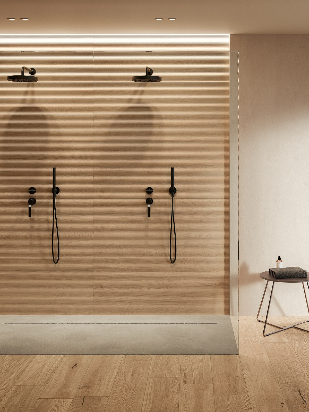Thanks to the technical properties of porcelain tiles, the LOG collection can also be used to furnish outdoor spaces using the decorative Deck solution with a 20 millimetre thickness, designed for a variety of settings, from private gardens to public spaces such as parks and resorts. Inspired by outdoor decking, the tile features a graphic pattern of juxtaposed slats with a knurled surface. Finally, LOG also includes solutions for walls in 120×278 cm and 50×120 cm formats with a 3D effect.