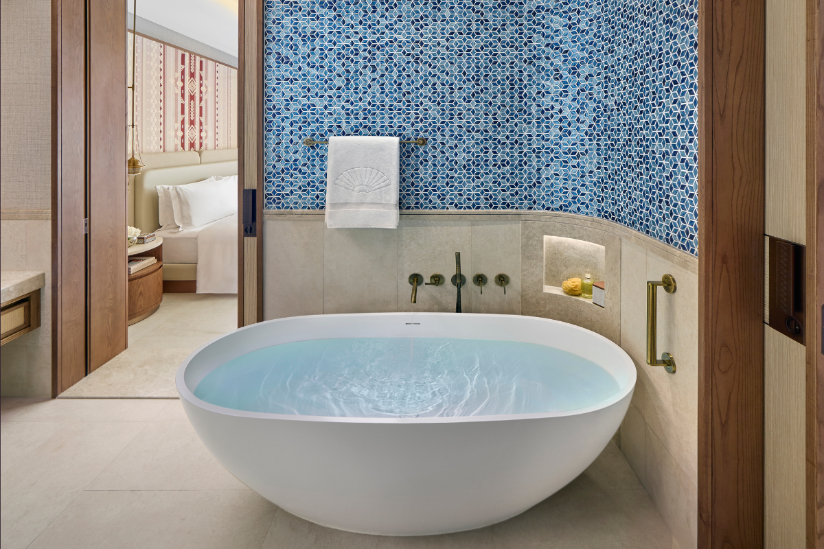 The warm, luminous atmosphere of Muscat is echoed in the brand’s material choices. Lims, a collection inspired by iconic limestone formations, was specified in ivory and grey tones for floors across guestrooms, bathrooms and balconies – subtly mirroring the hues of the Omani capital.