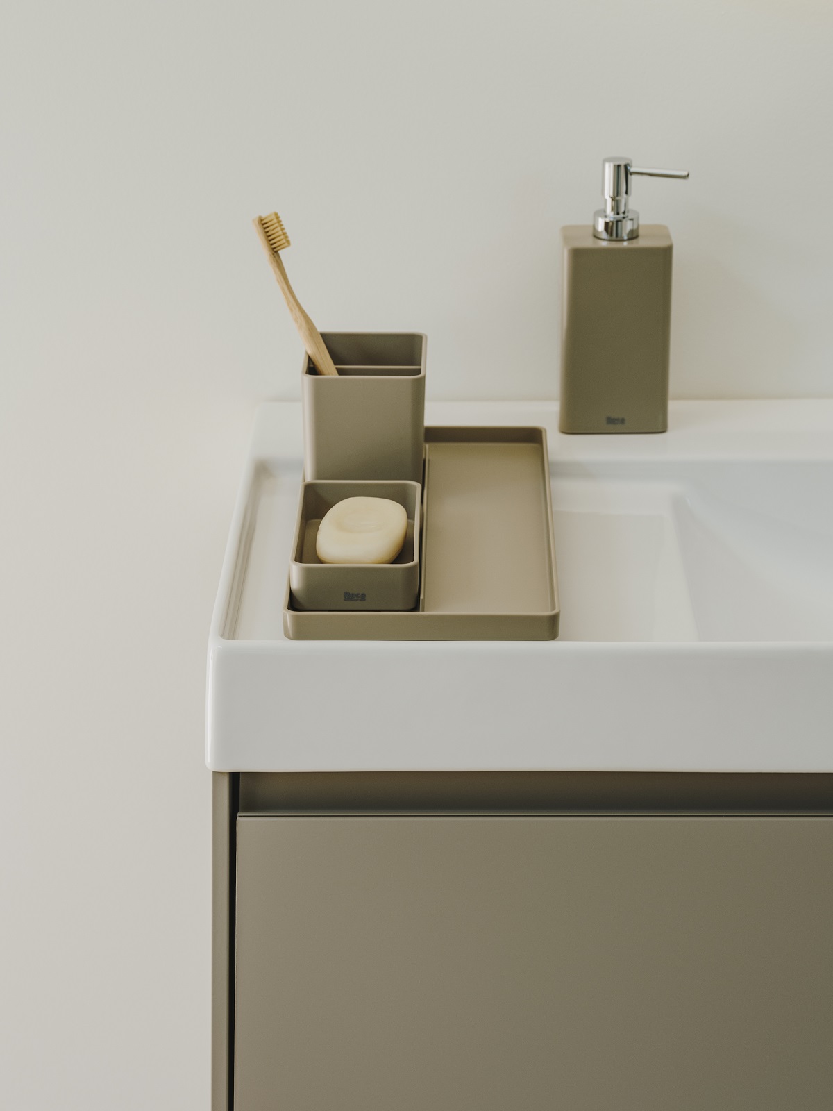 To complement the coloured sanitaryware and brassware, Roca also has coloured accessories so designers can achieve a fully coordinated look. The new Ona collection includes a pack with countertop elements (tray, container, soap dispenser and tumbler), available in three colours to perfectly match the furniture. Roca’s Tempo collection of contemporary bathroom accessories is also available in rose gold, titanium black, brushed titanium black and chrome to match the PVD finishes.