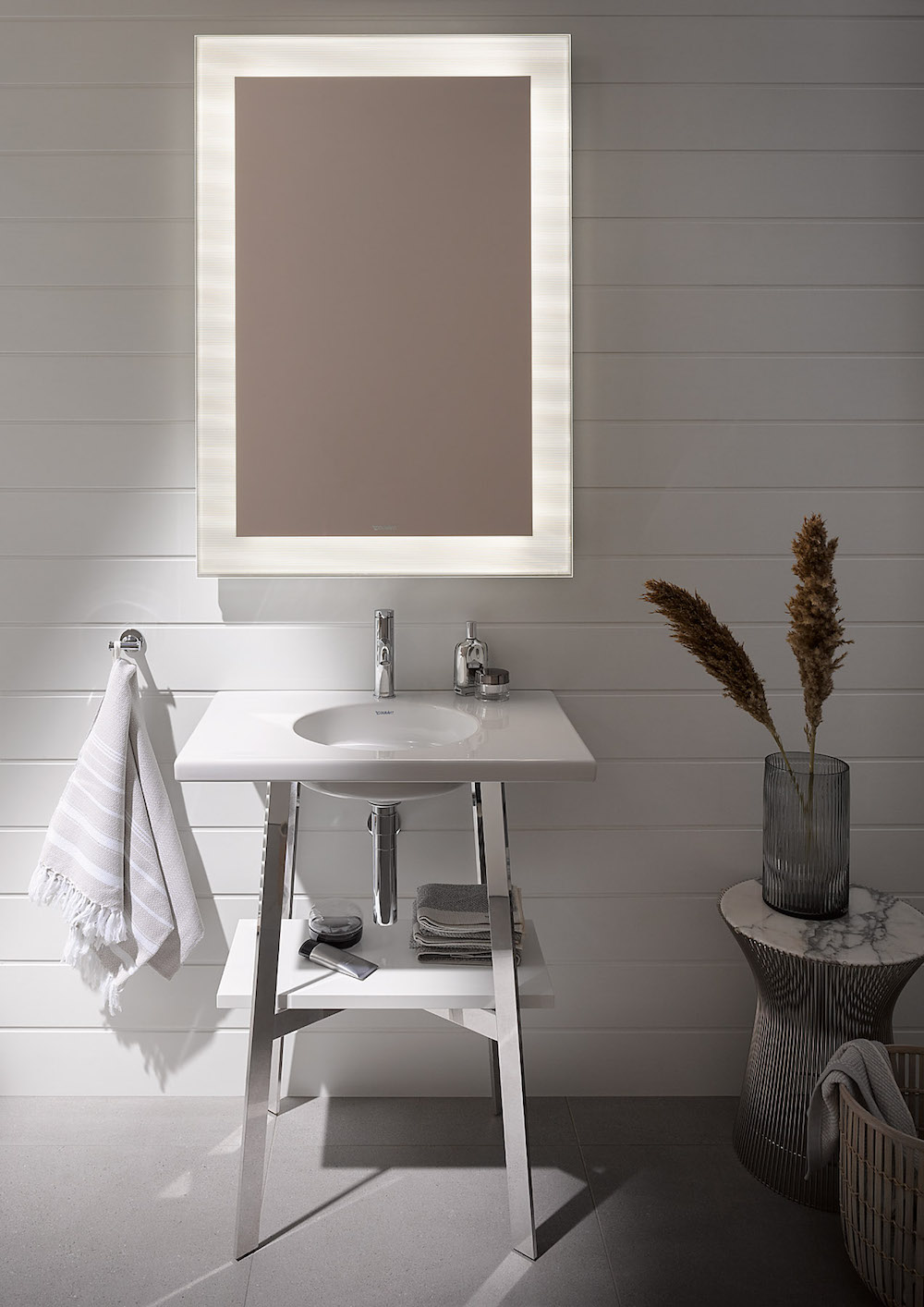 The elegant bathroom opens up a whole host of design options, especially for smaller bathrooms. With its innovative design for the washing area, Starck creates sheer elegance and a generous sense of space that exudes an inviting calmness. The combination of a 70cm-wide, gleaming white ceramic furniture washbasin with a floor standing chrome frame and integrated shelf in White High Gloss introduces a brand-new look to the bathroom.
