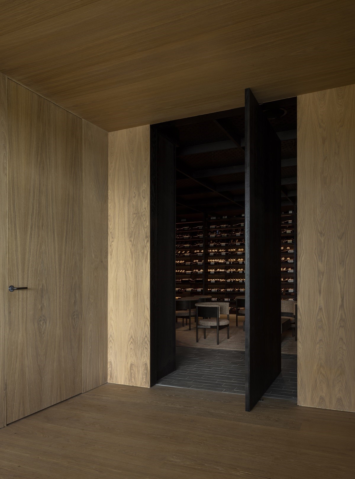 Inside, the ambiance is one of understated luxury. Lounge furniture by Japanese brand Karimoku invites guests to unwind, while bespoke artworks with organic forms pay homage to the restaurant’s natural surroundings. Every detail, from the stone counter in the open kitchen to the handcrafted wooden doors adorned with d line’s iconic architectural hardware, is meticulously curated to create a space that is both elegant and inviting.