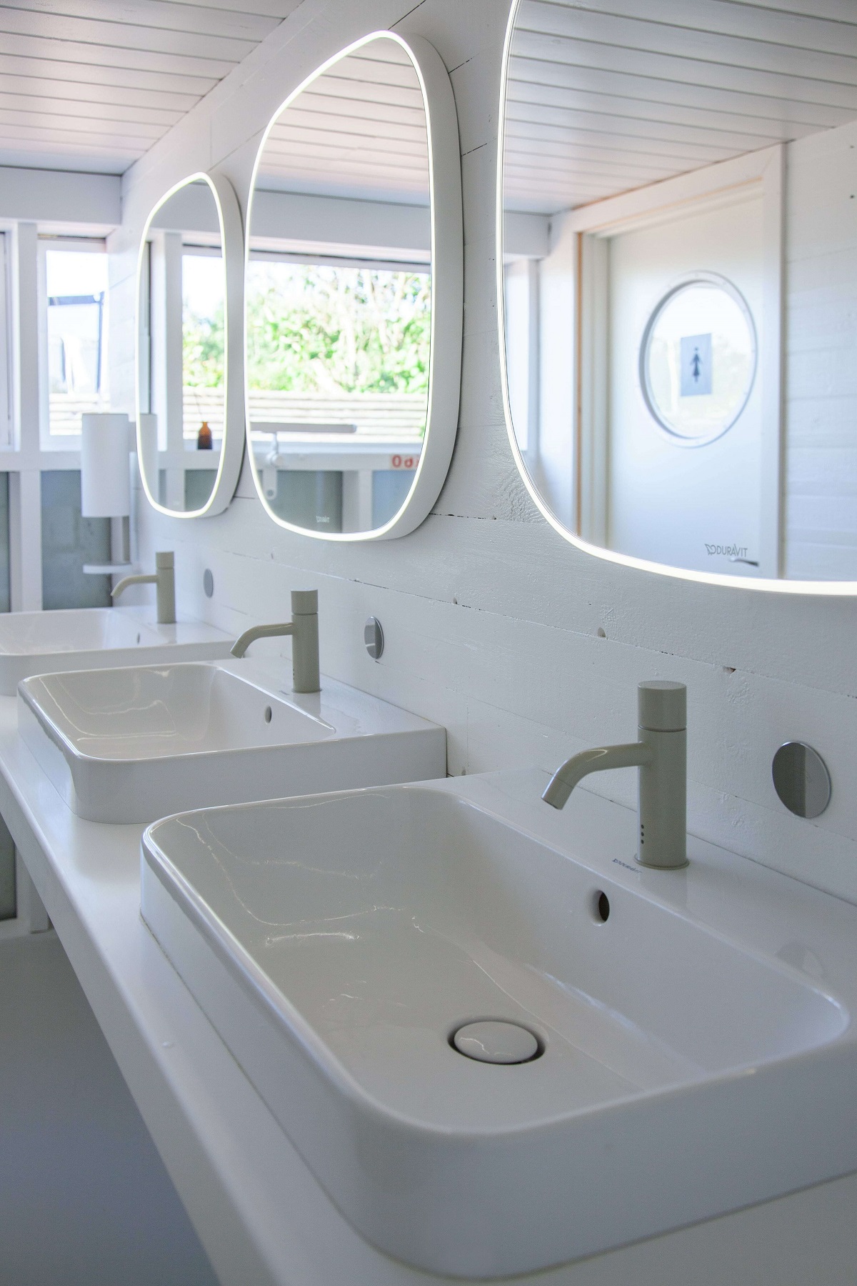 At the same time, the harmonious bathroom furniture of the sanitary areas is entirely in keeping with Arne Jacobsen’s vision: the elegant above-counter basins of the Happy D.2 Plus range, Zencha’s gently rounded mirrors, and the timelessly modern ME by Starck toilets harmonise perfectly with the architecture dating back to 1932.