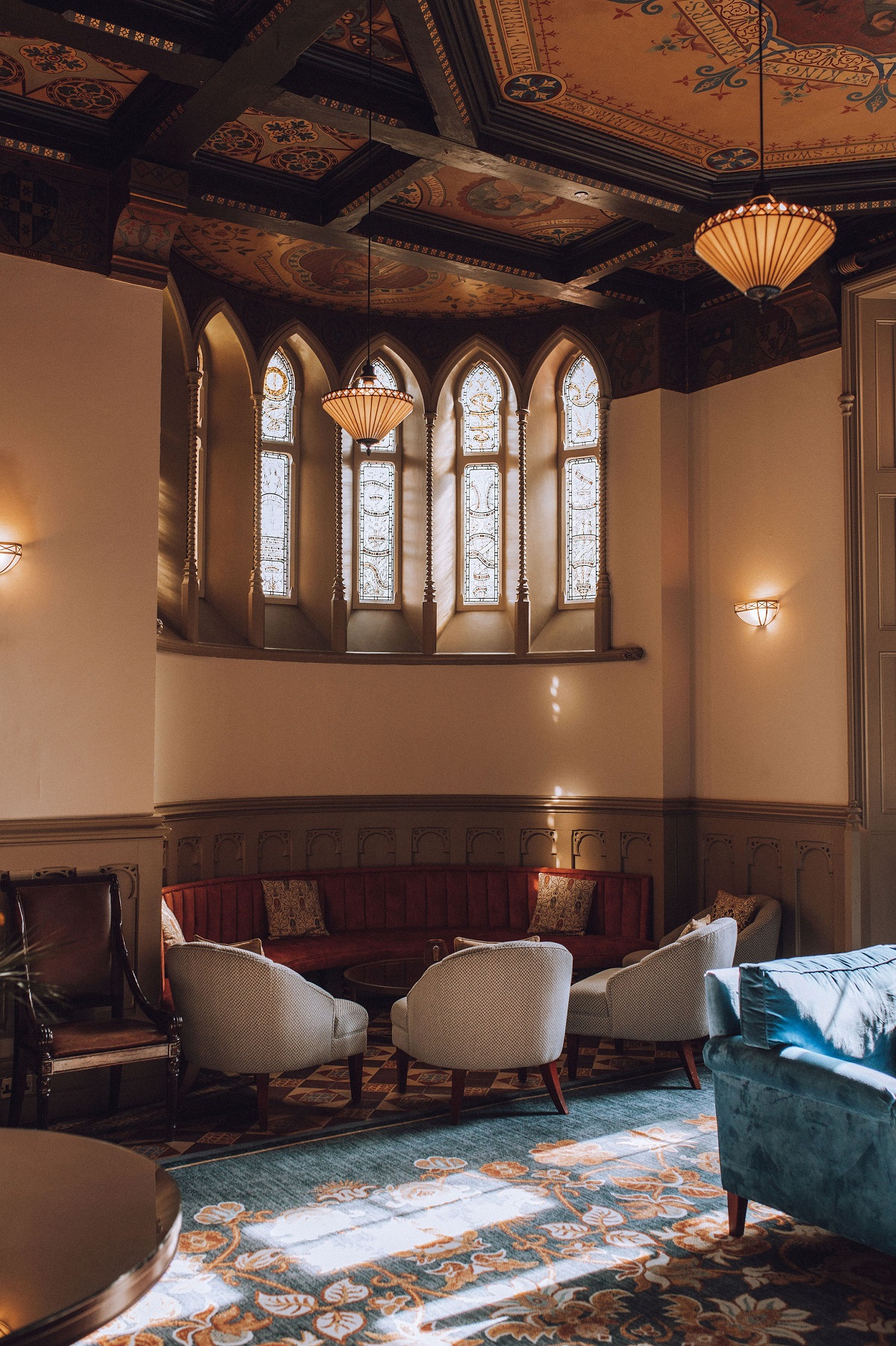 Guests are particularly impressed by the ground floor runners and rugs that highlight the original tiles revealed during the renovation. Designer Matharu’s favourite piece, however, is the rug in the Top Hall. “It brings a sense of opulence and enhances the intricate ceiling details and surrounding tiling”.