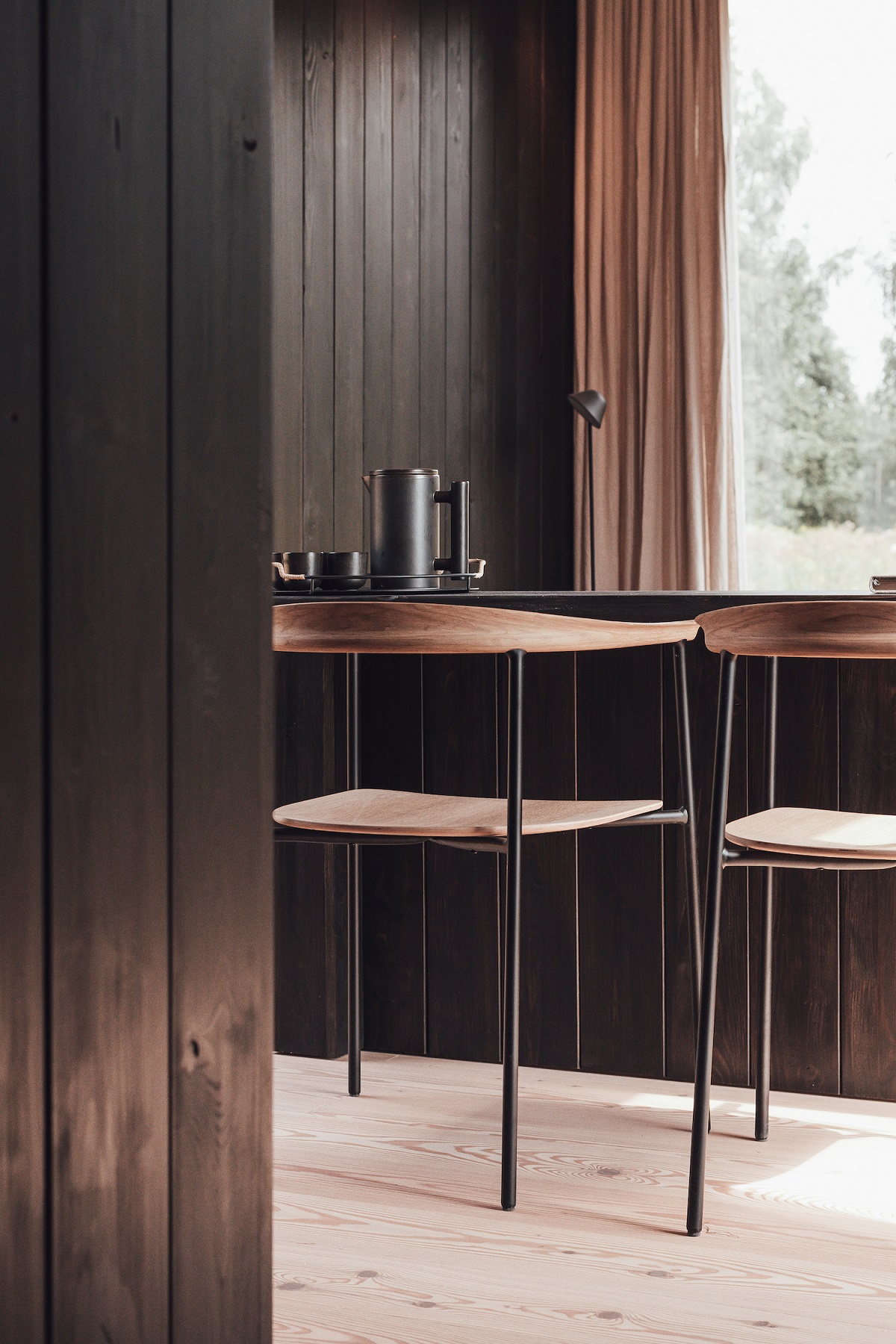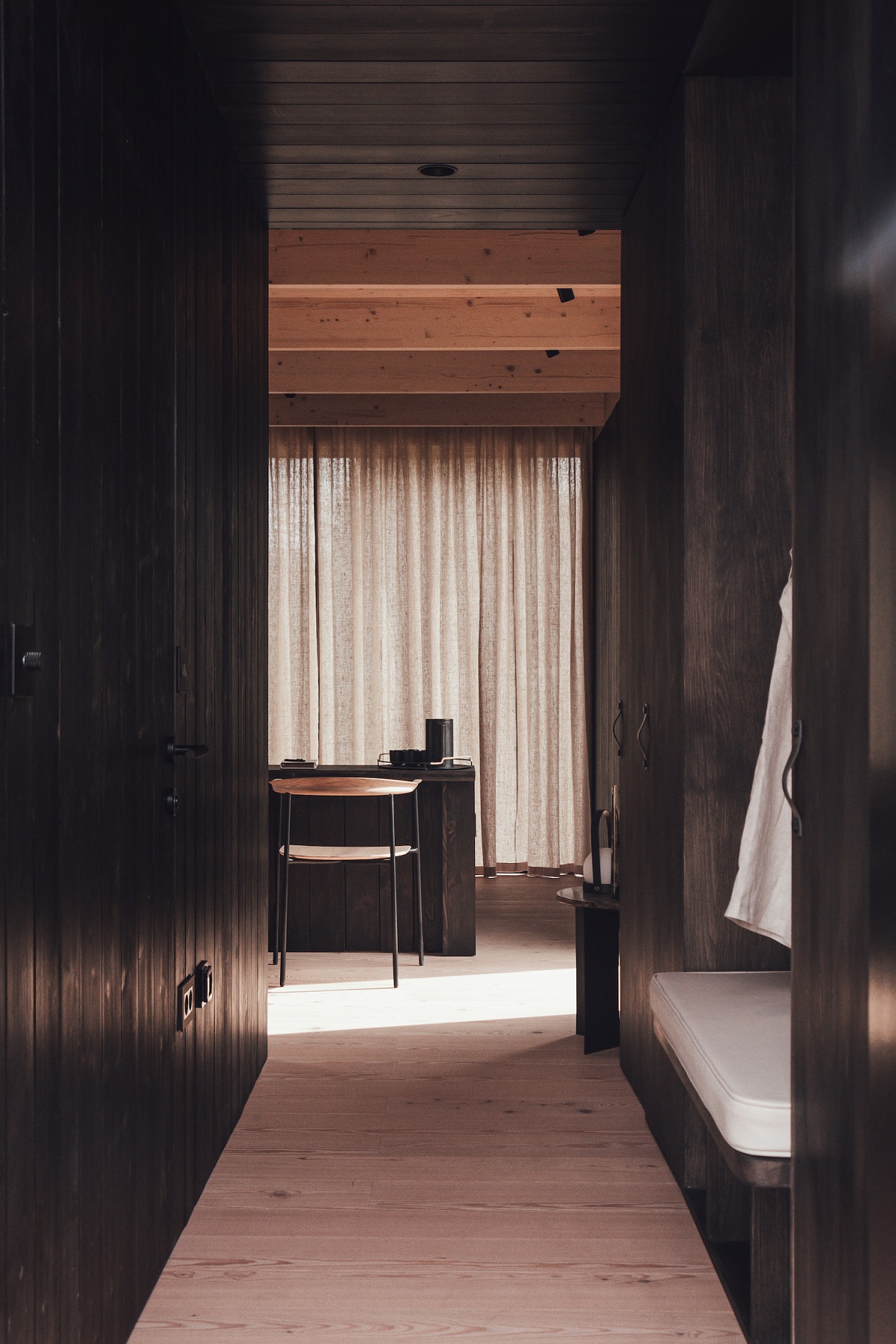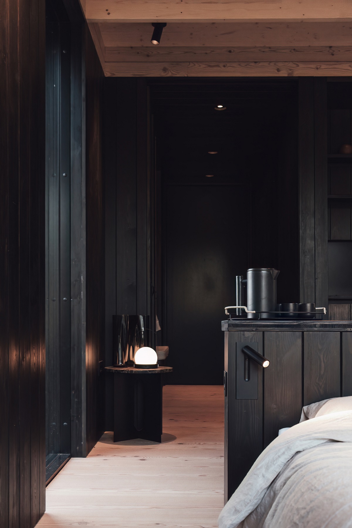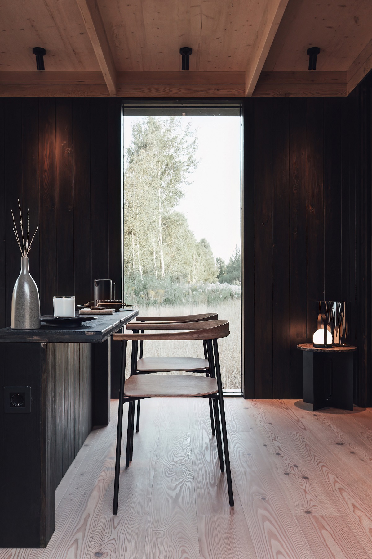 The cabin interiors have been inspired by the essence of the outdoors, which purposely reinforces a sense of escapism and a greater connection and emphasis to the landscape. With the interiors clad in wood the overall feeling is soft, welcoming and embracing, complimented by matching joinery and zonal lighting. The large floor-to-ceiling windows allow for plenty of natural light to flood the cabin, elegantly reflecting off the lightly toned planks and complementing the outside view – resulting in a beautiful full wood-on-wood scheme.