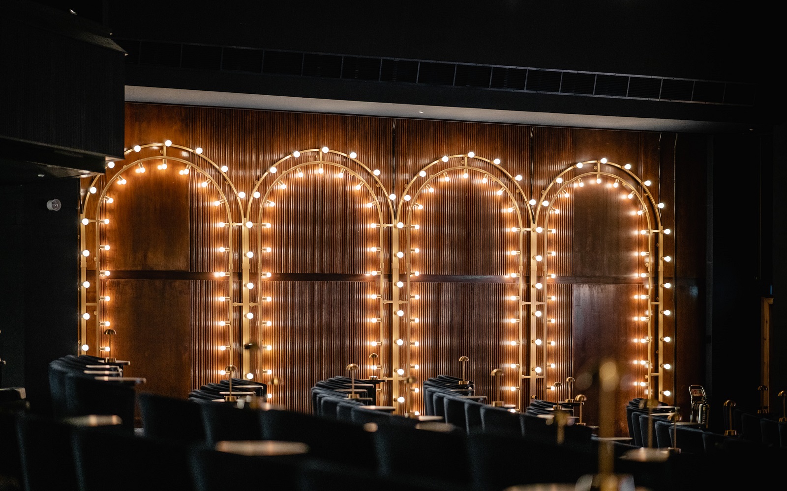 The renovation of the Warwick Wing Theatre is one of the most awe-inspiring feats of the entire refurbishment. Taking a contrasting approach to the classic aesthetic of the wider hotel, the theatre adds a striking contemporary touch of glamour and decadence to the hotel’s evening offering. The atmospheric space is brought to life with dazzling arched lights that emit a warm glow throughout the room, whilst the enormous main theatre pendant brings the entire room together. The impressive four and a half metre wide fixture comprises more than 100 individual bulbs housed on 18 arms. A satin gold oval pendant rounds off the range of bespoke lighting, complementing the other fixtures using 30 individual bulbs to bring a sparkle of showbiz to its surroundings.