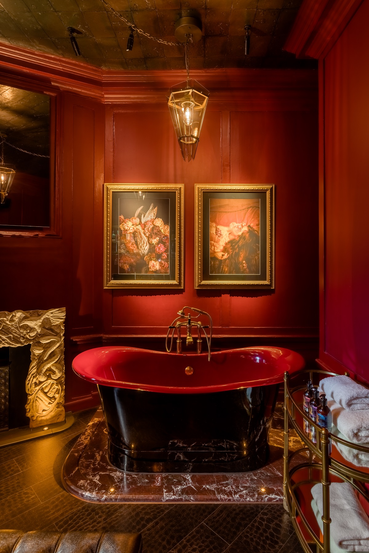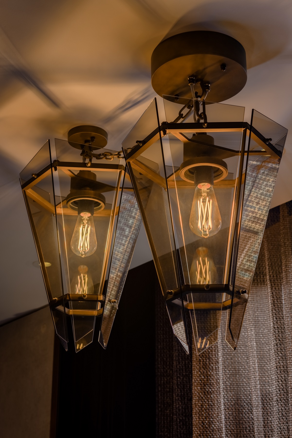 The Townhouse Apartments incorporate show-stopping Victorian-inspired baths to complement the immersive cherry-red backdrop of the interior, all haloed by light brass & glass shard industrial pendants. Toughened glass ‘shard’ panels were delicately infused with a smoke colouration, designed to softly diffuse the light to retain the dark, evocative atmosphere. Laser-cut ‘meat hooks’ were consciously used to secure the brass chain links draped between the pendants.