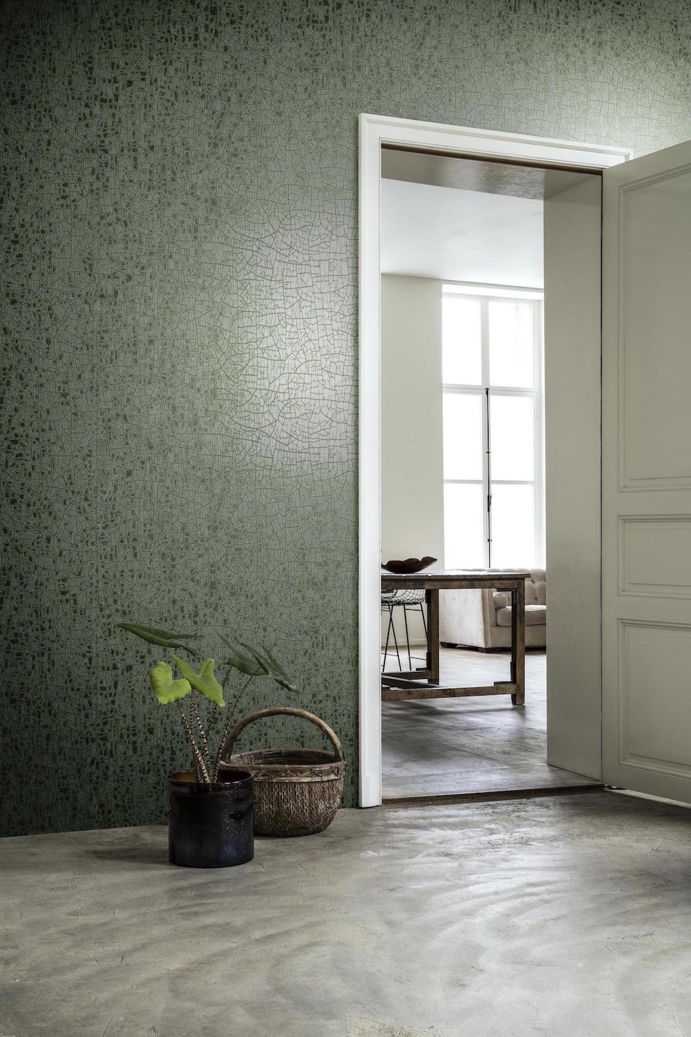 The second design Emaille comes in four colourways and resembles enamel pottery. The inspiration was found in weathered paint and dried earth, creating a patinated crackle effect. The glazed pattern is sophisticated and eye-catching, available in white, grey, sand and deep green.