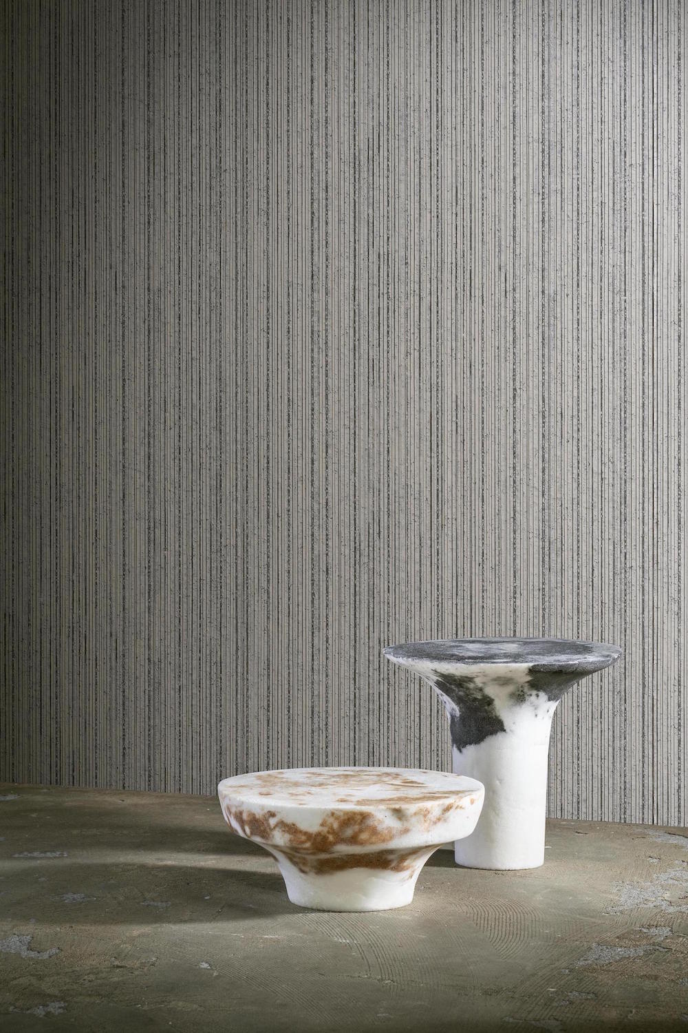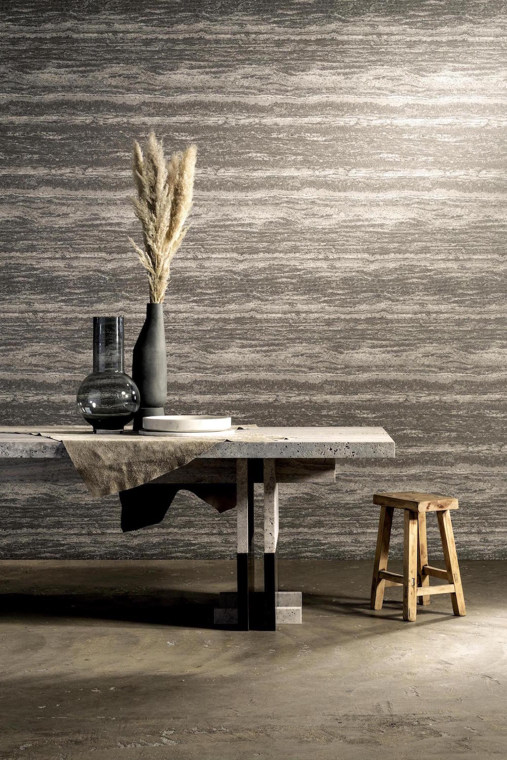 The fifth design Lustro is a combination of shimmering minerals, layers of stone and natural imperfections, creating a travertine marble-like appearance. The layers of stone and irregular patination create a dynamic design typical of this material. Available in warmer nude shades, as well as cooler grey and emerald green.