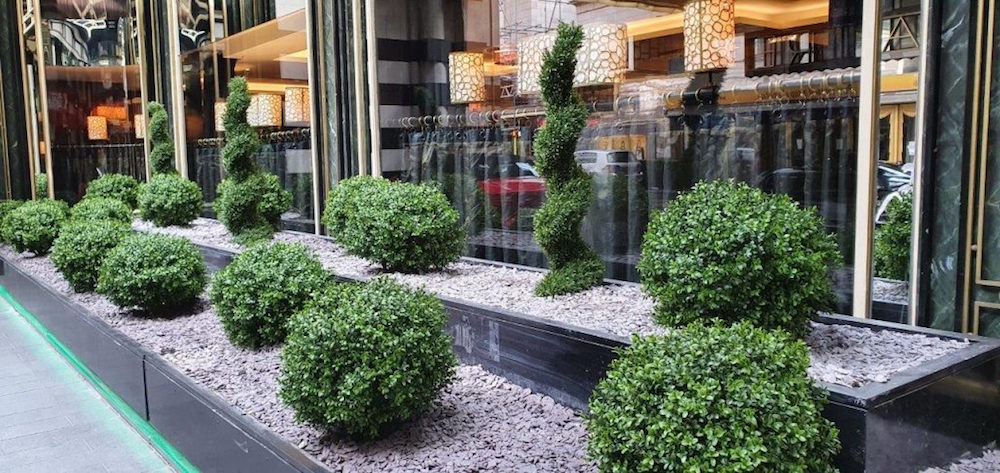 The Savoy completed a cost-saving exercise by switching their live planting at the front of the hotel for preserved/replica planting combination. Saving them money on their entrance planting as well as creating a magnificent first impression for their guests, a range of premium quality lifelike Buxus Ball Topiary and Buxus Spirals with slate top dressing planted into the hotel’s in-situ planter just outside their main entrance.