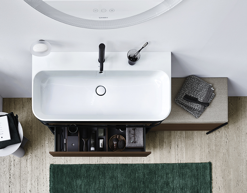 The new washing area variants can be ideally combined with all elements from the Happy D.2 and Happy D.2 Plus design series, ensuring a consistent design for the all bathroom furnishings. Happy D.2 Plus offers a consistent colour concept with toilets and bidets in Anthracite as well as bathtubs with seamless panelling in Graphite Supermatt – harmonising perfectly with the black metal console and dark furniture surfaces.