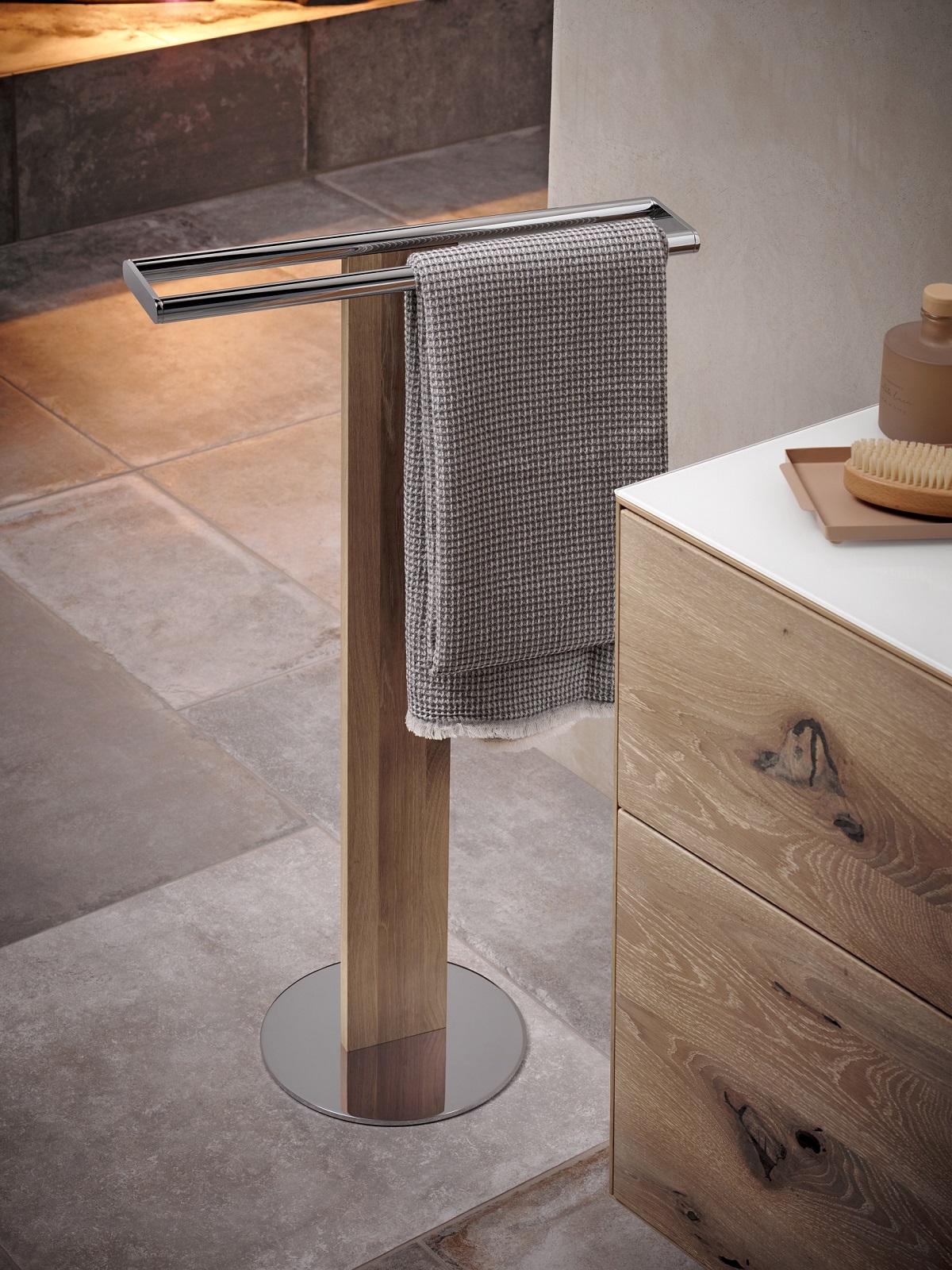 KEUCO fittings and accessories create a harmonious visual appearance with surfaces in classic chrome or new brushed finishes, including bronze, champagne-coloured nickel, or trendy black chrome. The EDITION LIGNATUR free-standing accessories for the washbasin and toilet incorporate different types of wooden furniture and designs into the range.
