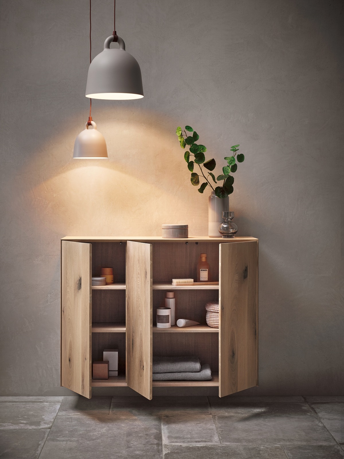The open shelf is the perfect stage for your favourite products, while the LED lighting can be dimmed by means of a panel giving you the possibility of changing the light colour from warm white to daylight.