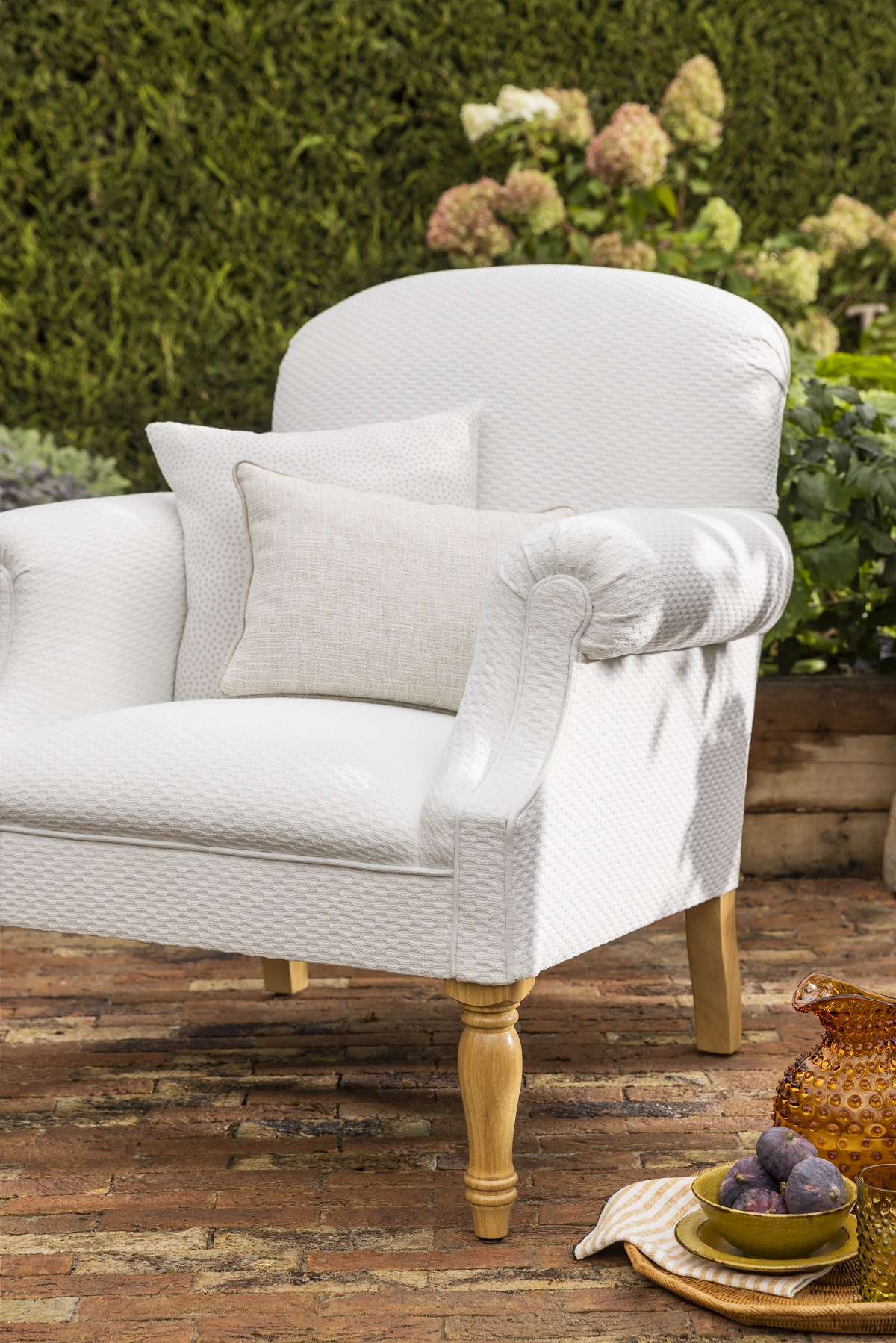 The Outdoor Collection is built with five key principles in mind, to avoid water damage and keep the furniture looking crisp and stylish for years to come. These include ensuring the use of high-performing fabrics, particularly solution-dyed acrylic textiles, which means water beads on the surface and runs off. Additionally, certain designs are avoided if they have areas that could attract moisture, so that water can evaporate efficiently off the surface of the piece.