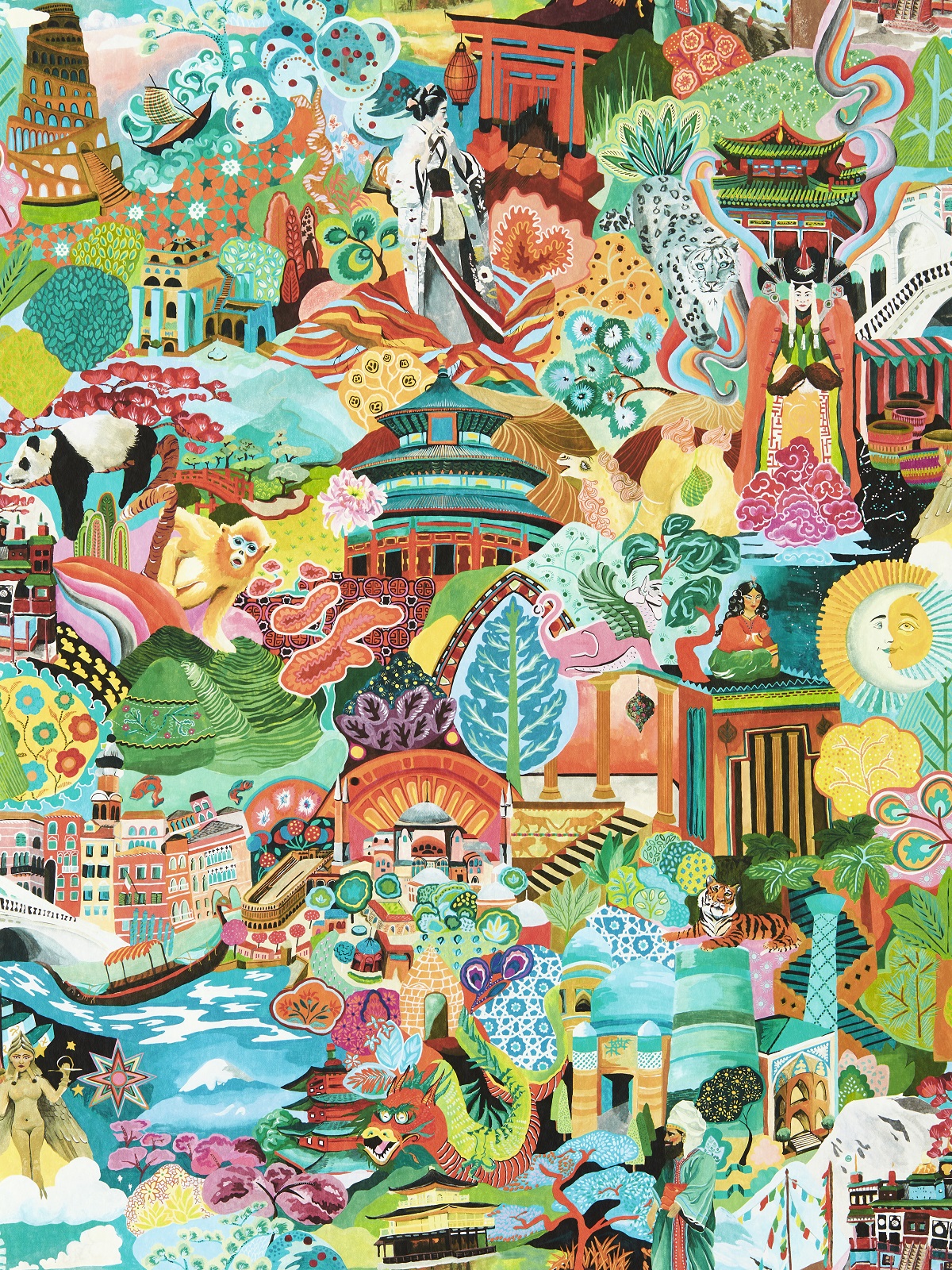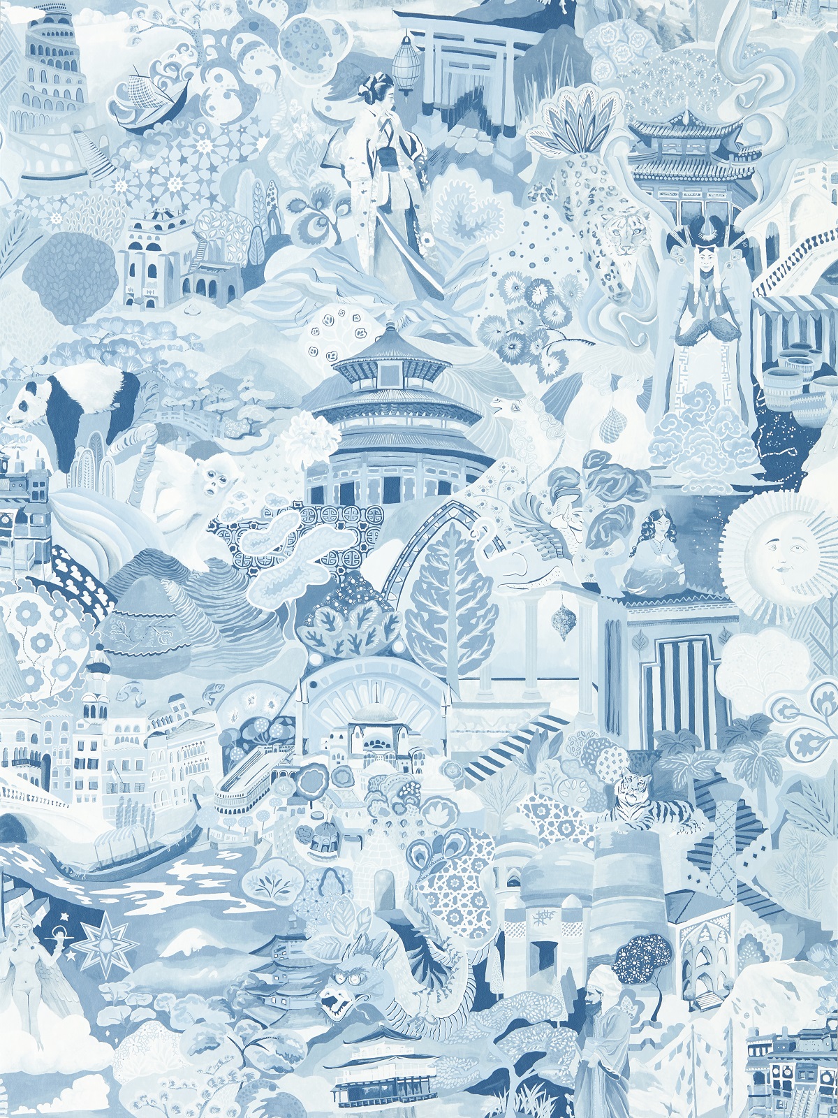 The Harlequin design journey begins with the glowing midnight colours of China’s lantern lit streets and the gently meandering rivers in the same glorious turquoise shades as Uzbekistan’s mosaic clad architecture. In ‘Journey of Discovery’, the Hanging Gardens of Babylon sit alongside the Tower of Babel, surrounded by geishas, goddesses and emperors, snow leopards, giant pandas and the mythical Chinese dragon. Like a map of the Silk Road, this wallpaper charts a voyage of discovery in a remarkable and ornate piece of hand painted cartography.Together with nine further wallpaper designs, that are all suitable for contract settings, this collection includes the sights, experiences and some inspired interpretations of the ancient trading route.