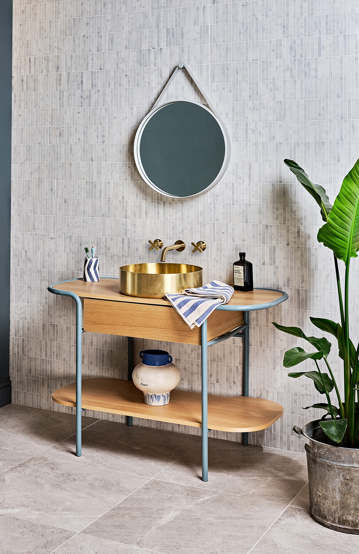 Strong accents in a small space can add a touch of glamour. A gold basin is a great way to make a statement using metallic surfaces. Keep things classy by pairing with modern neutrals, such as the new Ca’ Pietra Long Island Marble Honed Bamboo Mosaic tiles – a classic white marble with grey veining.