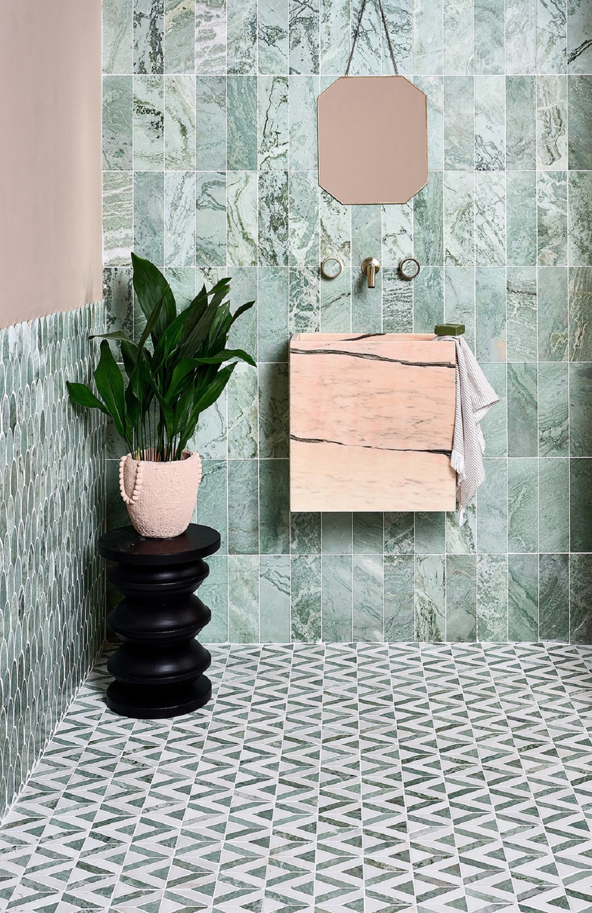 The pretty and on-trend pale pink and green combination, which features the new Ca’ Pietra East Java Marble Honed tiles alongside the Hummingbird Marble Brick and Plumbe Mosaic Hummingbird add layers of pattern and tone without crowding the space. The striking floor tiles are the Ca’ Pietra Hummingbird Temple Mosaic.