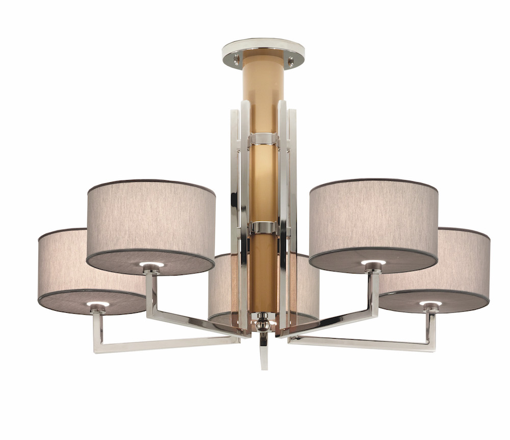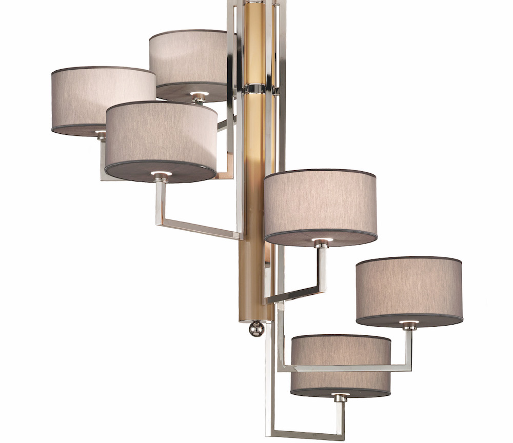 Manufactured with a nut-brown painted stem, finished in polished nickel with stone or dark grey coloured chinette shades this collection would fit perfectly in architectural surroundings with a muted colour palette. This collection would complement wood built-in cabinetry or detailed art due to its more minimalist design.