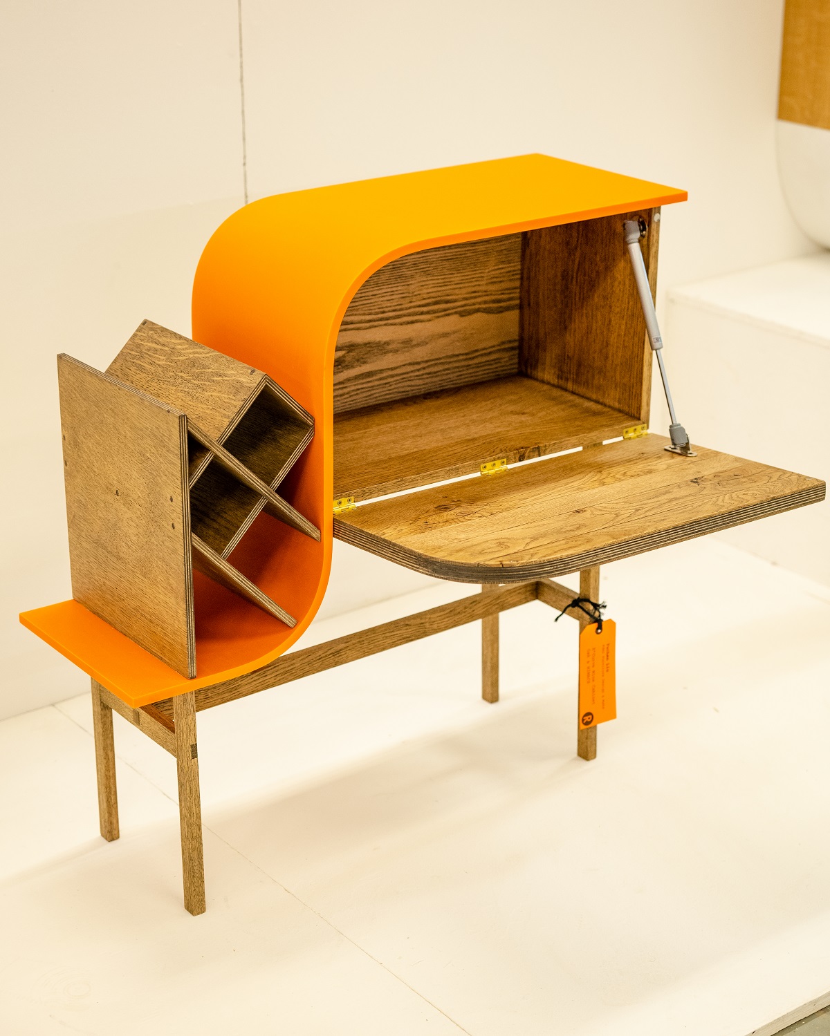 Liu’s cool and contemporary bar cabinet design is a true celebration of HIMACS, using its bright orange tone complemented with stained European oak to create a visually arresting piece of furniture. What made his piece stand out for the judges was the originality in its use of HIMACS, and the way in which he had formed the surface to create a seamless s-shaped curve. This feature ran across the top of the cabinet before cascading down its side and tapering off to create a multi-level effect.