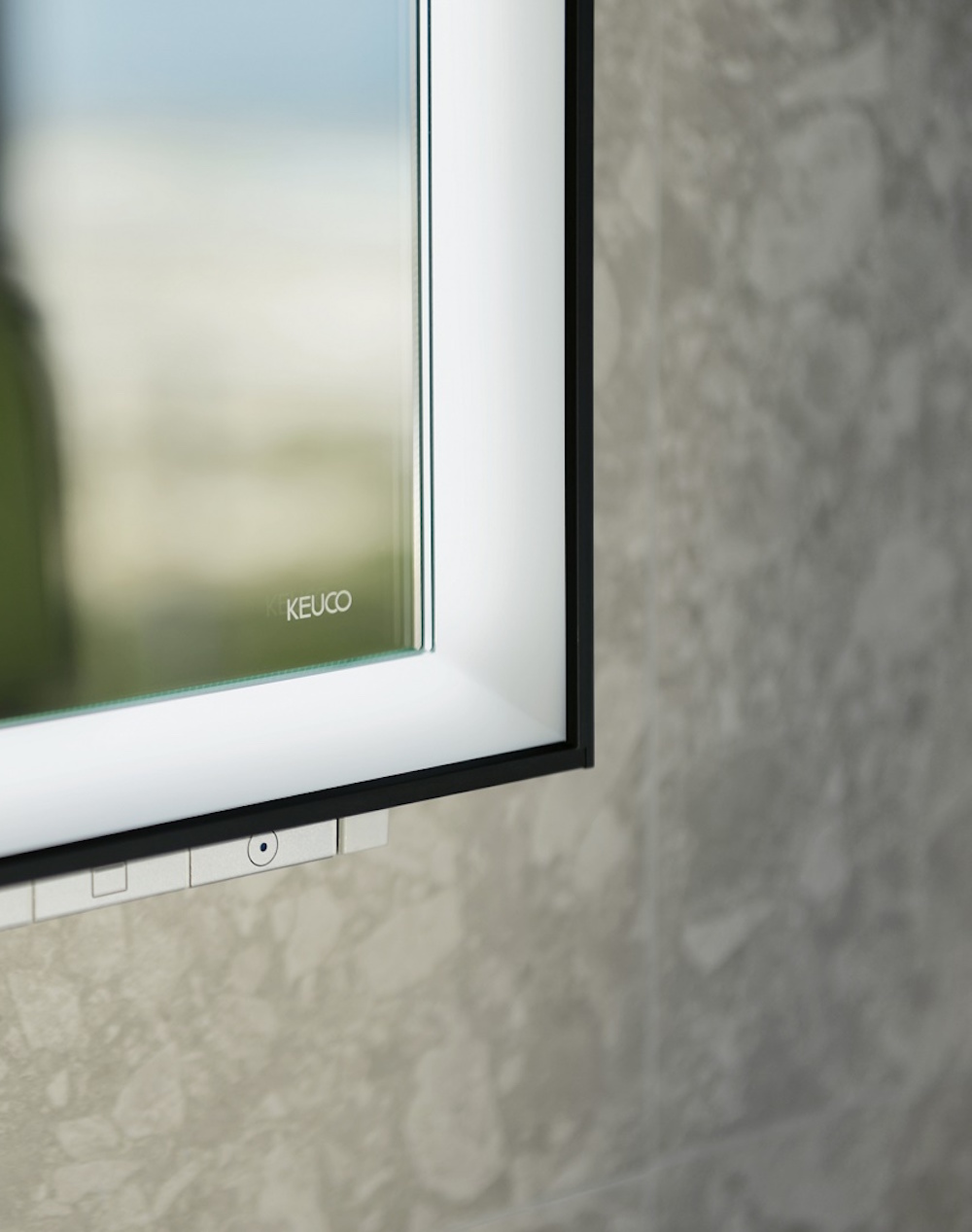 The iLook_move cosmetic mirror with brushed black chrome PVD coating adds the finishing touch to this darkly accentuated, colour coordinated bathroom design with matt-black surfaces, metallic optics and luxurious KEUCO bathroom furnishings resulting in a sophisticated interior.
