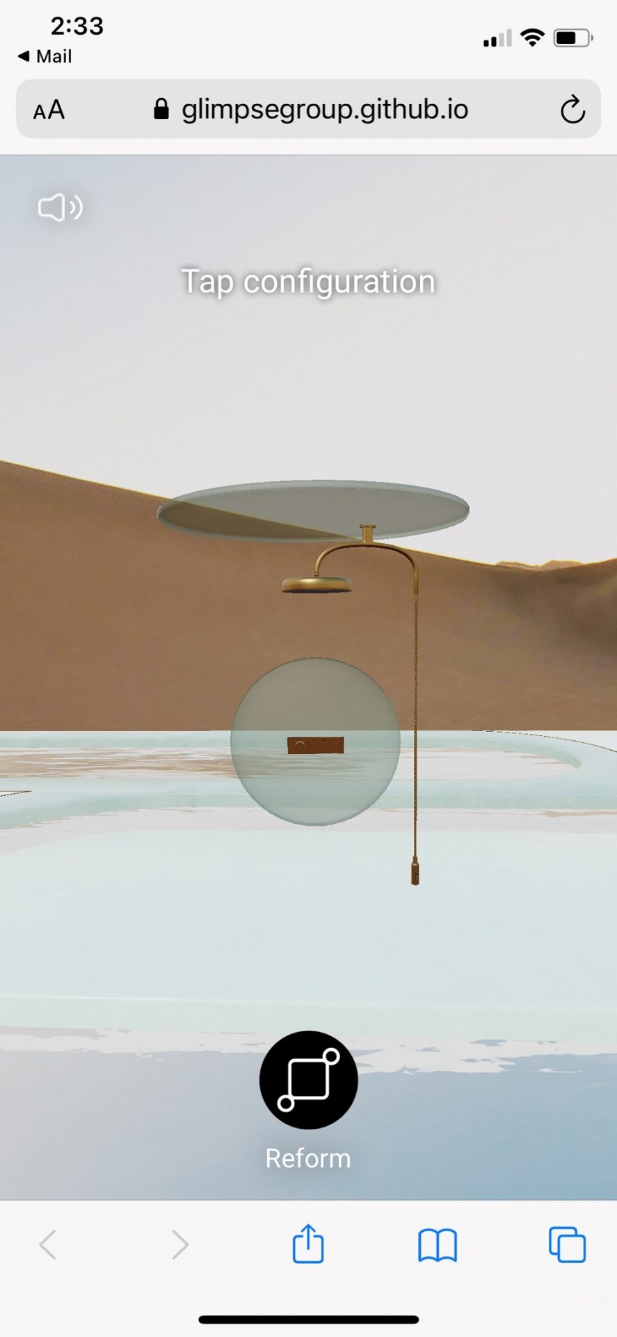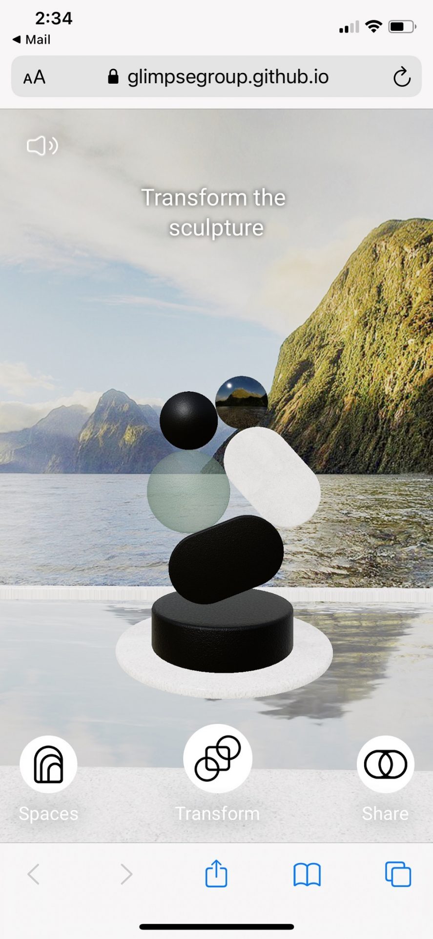 The spatially-aware, mobile and webAR browser experience enables participants to step inside a 360° virtual space to explore three beautiful landscapes that showcase Kohler’s products. Within these landscapes, participants can find and interact with a life-sized, animated, abstract sculpture inspired by the physical sculpture, as well as rotate, pinch and zoom in to examine the details.