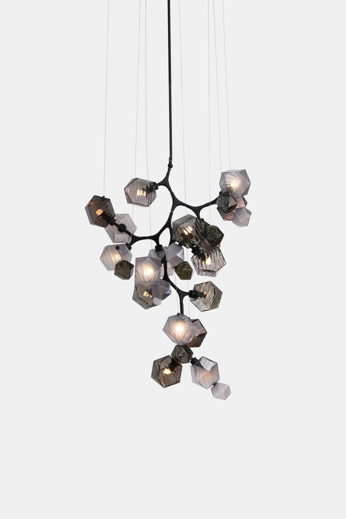 The David Rockwell capsule collection celebrates the Welles Chandelier’s classic geometric form, while creating a contemporary light fixture inspired by clusters found in nature, such as crystals, chemical compounds, and clouds. Ultimately, Rockwell drew from botanic forms to create an organic assemblage. The hollowed glass polygons act as metallic light points that come together at varying heights and dimensions to form a floating light cluster. The feature chandelier is defined by its luxe volume and organic nature.