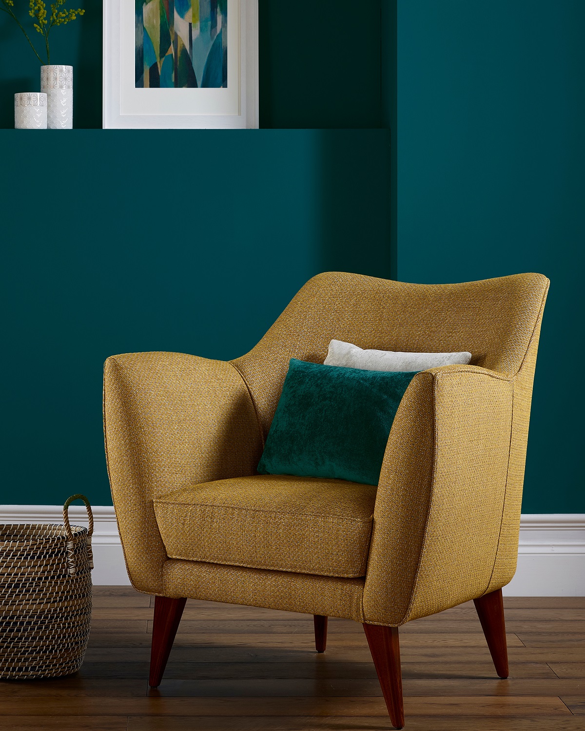 chair and cushion in Sekers fabric in mustard and teal from the Odisha Collection