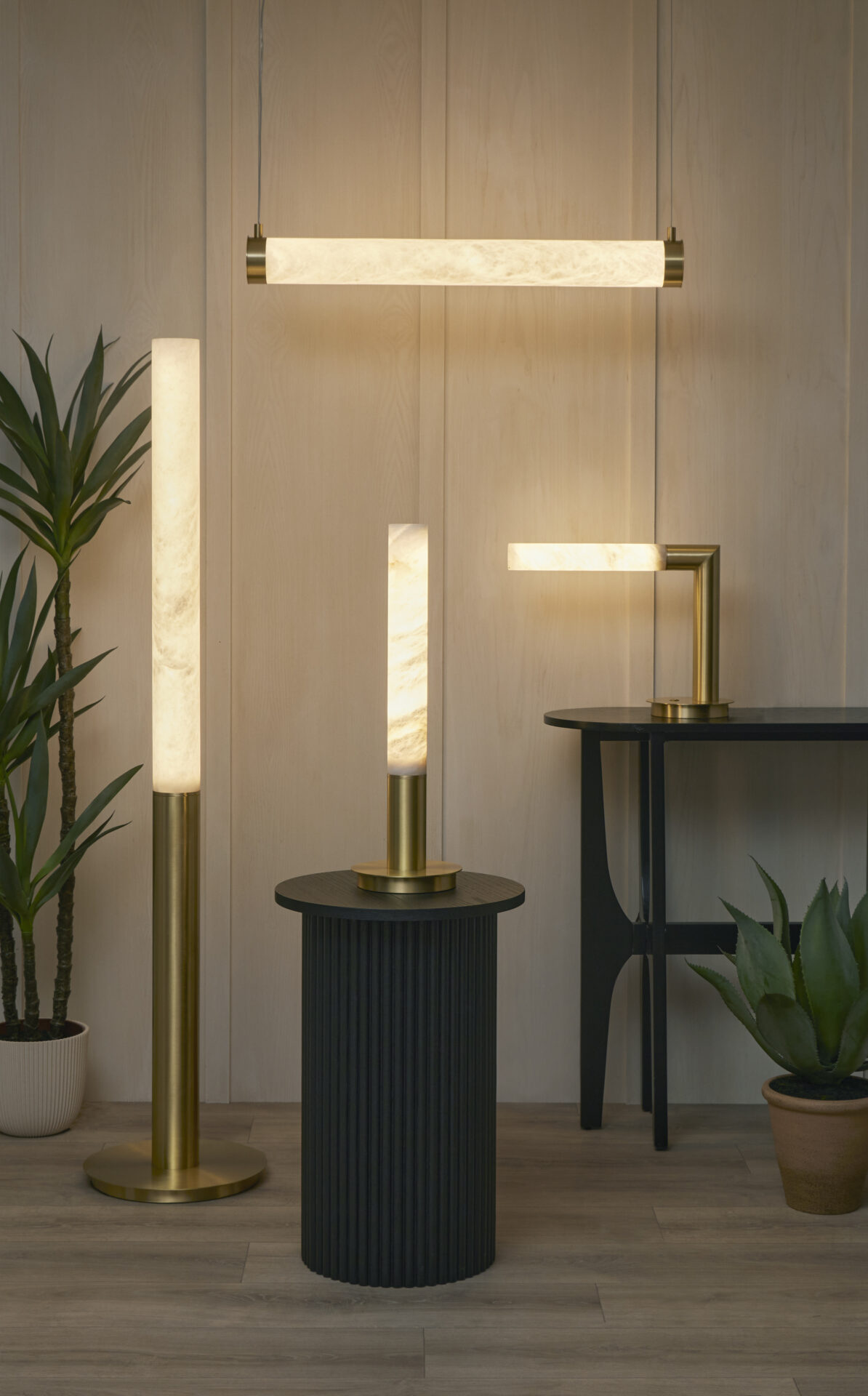 Refined and understated, Geo epitomises quiet luxury. Clean, linear forms are elevated by the use of high-end materials – richly veined alabaster and solid brass – creating lighting that feels grounded yet ethereal. This minimalist design embraces restraint, letting the inherent beauty of each element speak for itself.