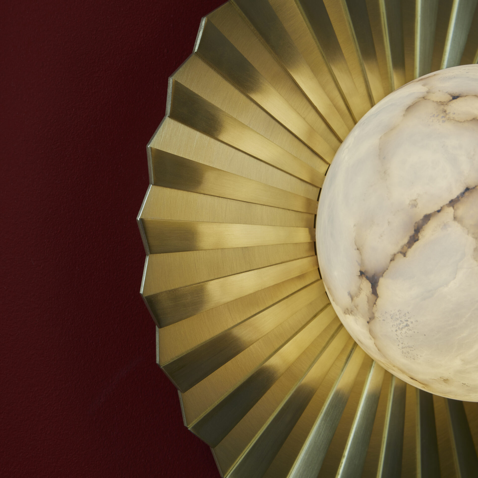 Inspired by sweeping vistas and the layered warmth of sunset skies, Vistal is a tactile and immersive lighting piece. At its heart, a globe of opal glass or alabaster radiates softly, surrounded by a base formed from individually applied, laser-cut brass layers. These pleated brass elements catch and refract light in subtle rhythms, creating a dynamic play of glow and shadow.
