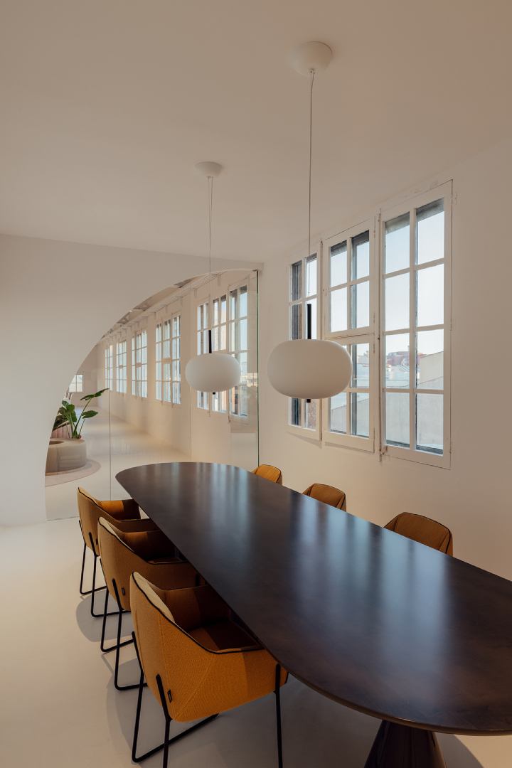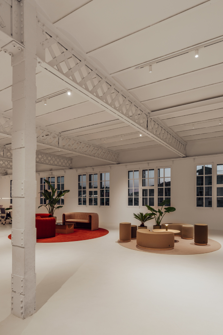The goal for the design was to create an open and comfortable space that would encourage creativity, learning and continuous change. To achieve this, Isern Serra chose to maintain the original structure while opening the workspaces and creating small meeting islands, steering away from the typical glass enclosures found in the office design world. Hence, the closed spaces were conceived in the form of micro architectures that interact with one another and create an interior sculptural passage of cubicles with circular openings, creating doors and windows that allow the light to circulate and evoking a world of art and creation. All this stylishly brought together with white shades, smooth lines and warm lighting.