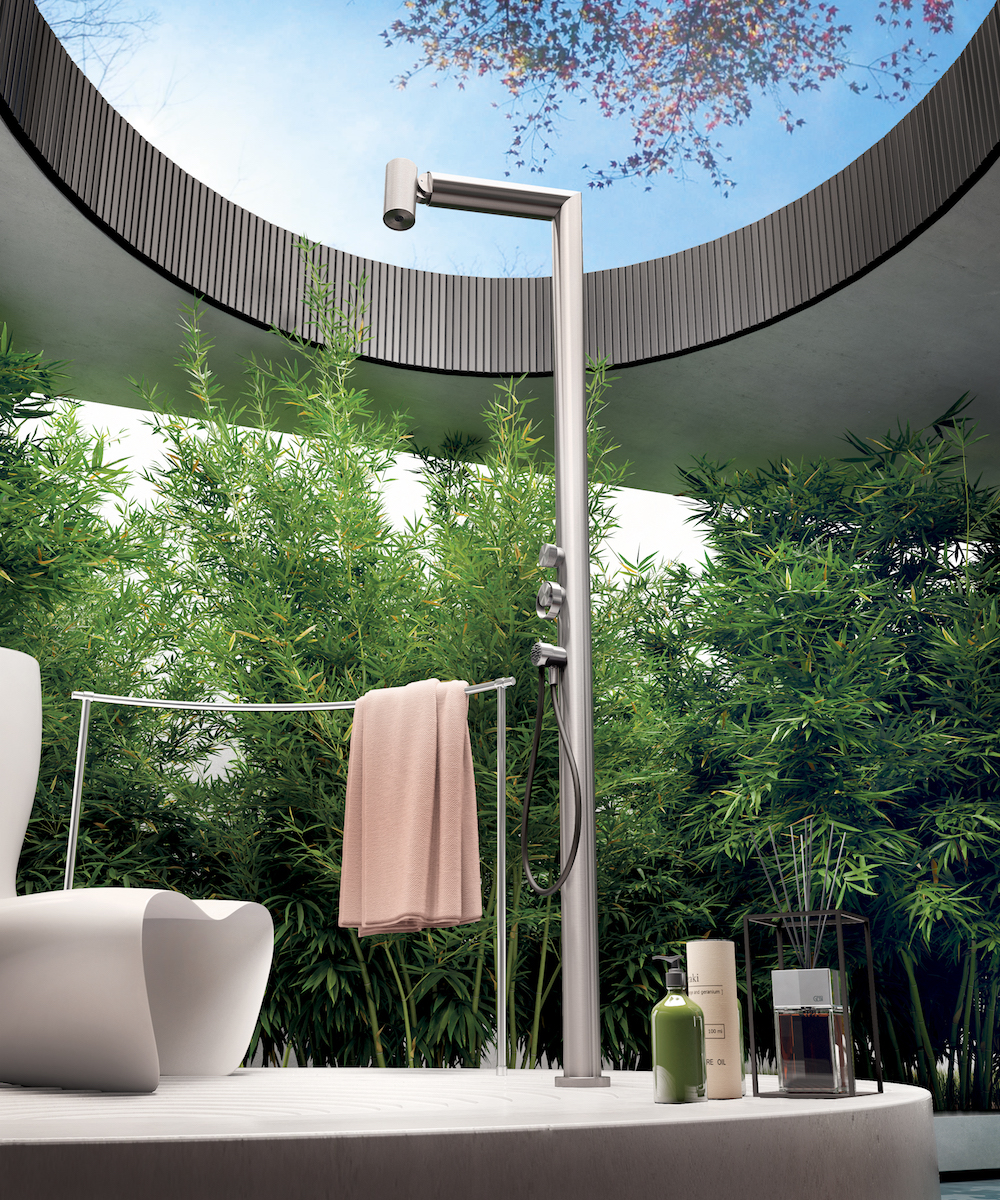 The shower columns of the Gessi Outdoor Wellness System have been specifically designed for outdoor spaces. They offer innovative combinations of materials, finishes and processes, with the aim of recreating the stylistic and functional pleasantness of the Gessi Private Wellness System in the open air.