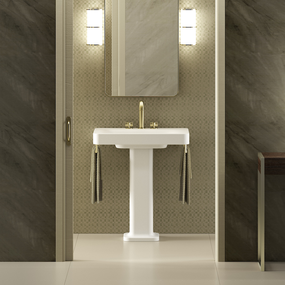 The range also includes a new line of classically inspired brassware: deck-mounted and built-in basin faucets, a bidet faucet, a thermostatic shower column faucet and a thermostatic freestanding bathtub faucet. These are all available in three finishes: greige, brushed steel and chrome. One of the unique features of this brassware range is that, in spite of its classical design, it is equipped with innovative technology; for example, thermostatic technology has been incorporate into the freestanding retro-inspired bath filler and the retro-look shower column, delivering thoroughly modern efficiency.