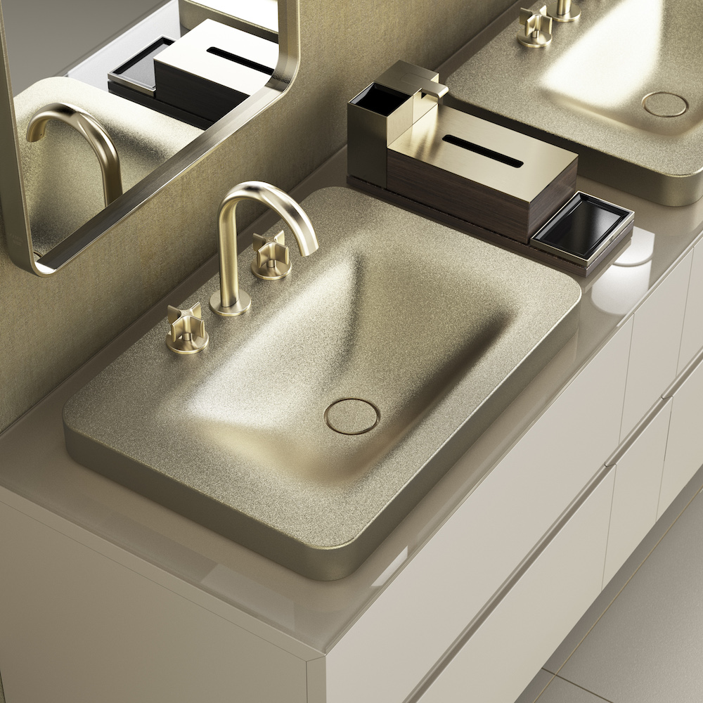 The wide range of countertop and over-countertop washbasins offers endless combinations of brassware, allowing the adaptation of the pieces to suit every type of bathroom. The introduction of exciting new metallic finishes extends the embellishment on offer to help create bathroom spaces of increased sophistication and elegance. Two luxurious shades – a matte gold and dark metallic – are used in a revised version of the shagreen finish. The resulting shagreen matte gold and shagreen dark metallic adds a touch of unusual elegance. The basin options now also include a new, stylish pedestal model, which complements the rest of the collection and can be fitted with integrated metal towel rails in various finishes.