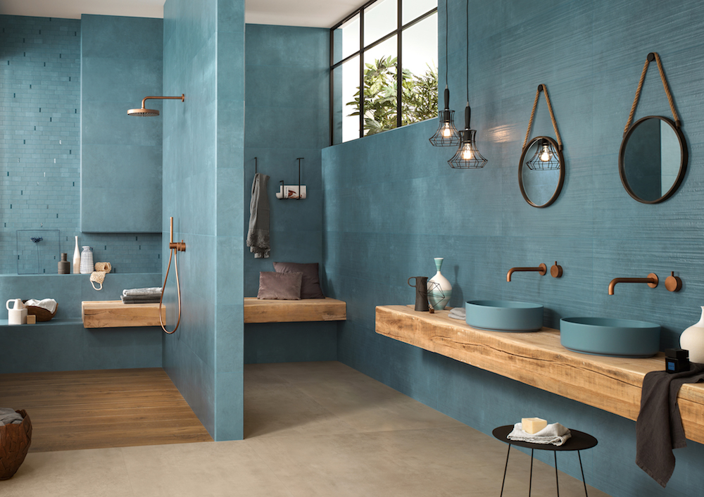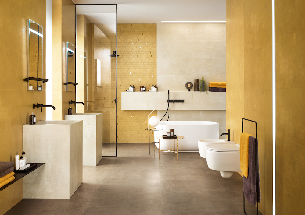 For the floor, the slight “spatula” effect evokes the authenticity of craftsmanship, increasingly popular in contemporary design projects where the imperfection of a “handmade” look is an expression of value and attention to detail. For walls, the accents of Mustard and Powder Blue allow for strong creative discontinuities accentuated by the availability of material and graphic decorations with a strong visual impact.