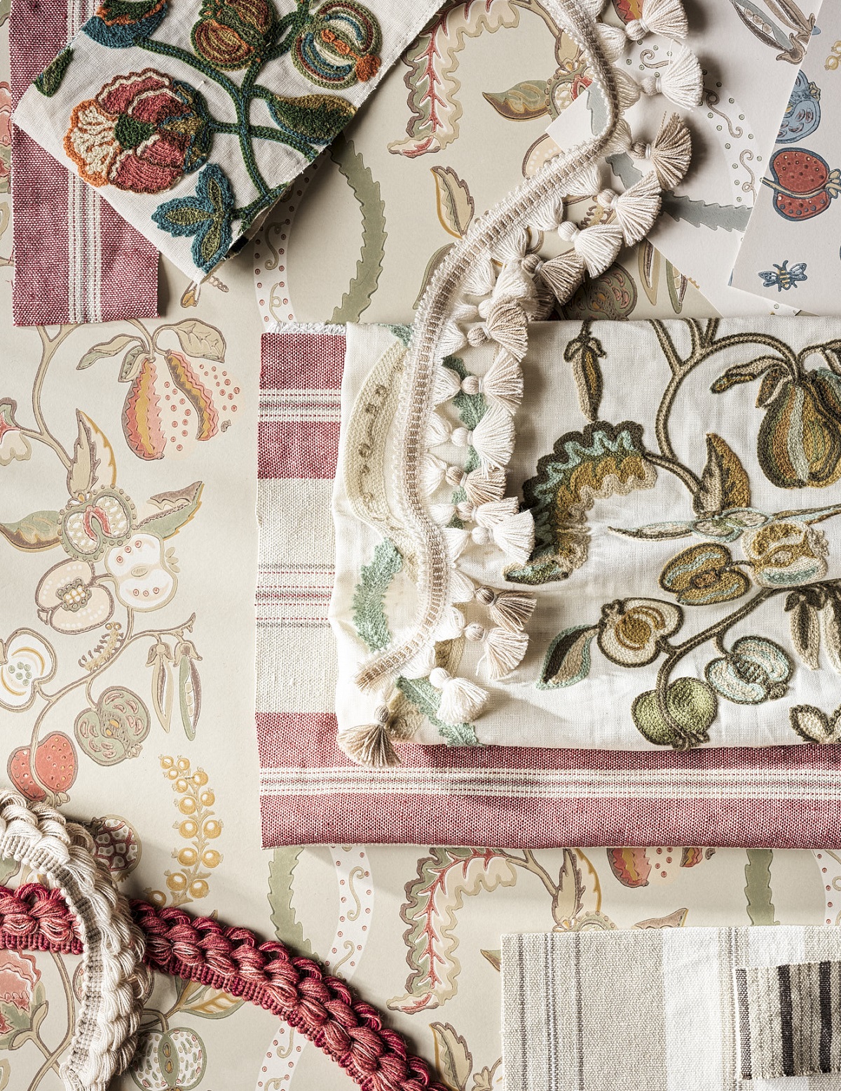 Damasks, toiles, tapestries, garden plans, and archive florals come together in a signature palette of Sanderson shades for a layered and decorative collection