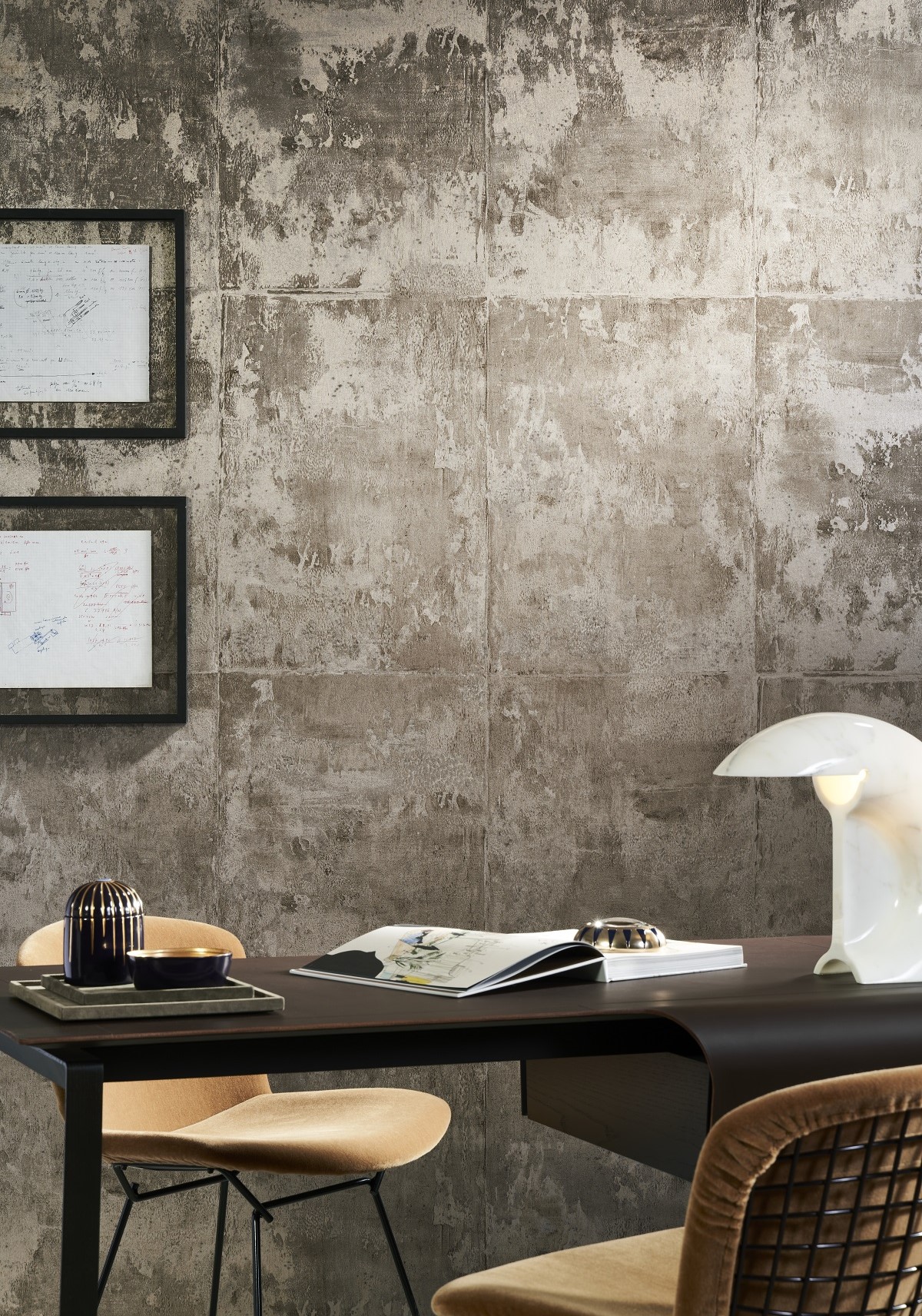 The final design in the collection, Platinum, is a slightly weathered block pattern, which looks aged to perfection even with a picture- perfect patina. Matte and luminescent sections cast a warm metallic sheen on this eye- catching wallcovering. Platinum is available in nine colourways.