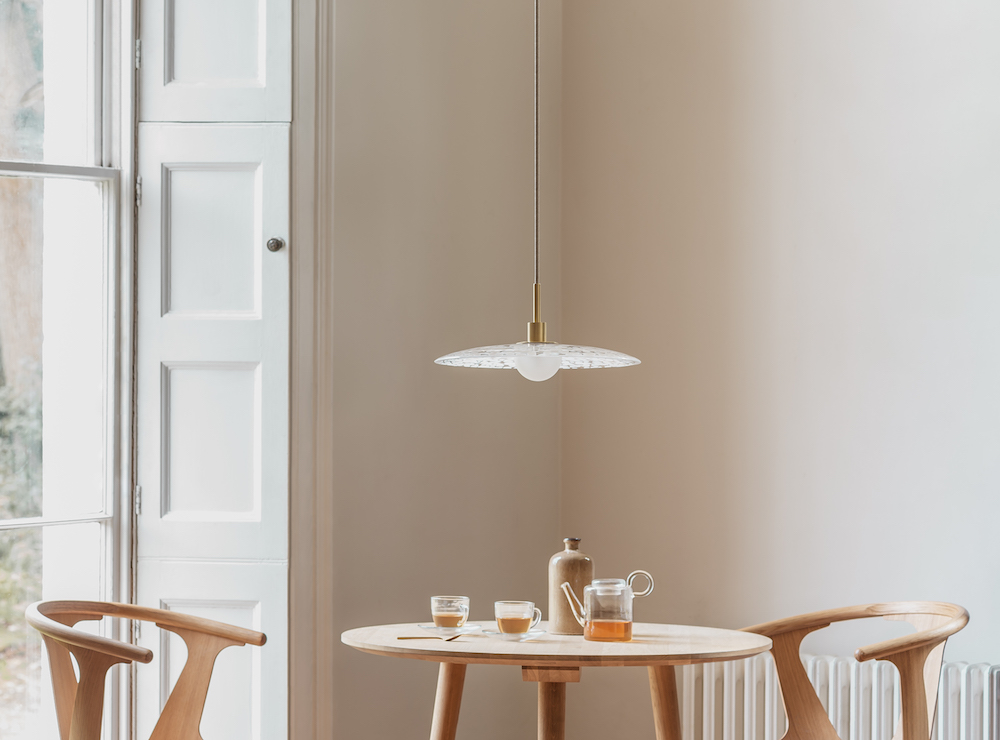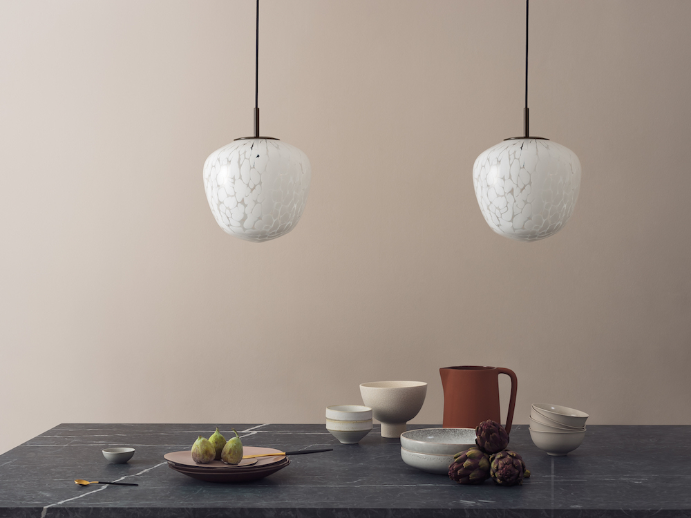 White glass grains disperse naturally across the surfaces of Heathfield’s new Milo and Cosmo pendants, forming irregular patterning unique to every piece. Evoking a sense of serenity, the cloud-like formations captivate, inspiring the imagination to detect individual shapes and outlines. In two considered forms, light diffuses softly though the glass, casting harmonious reflections across their surrounding space.